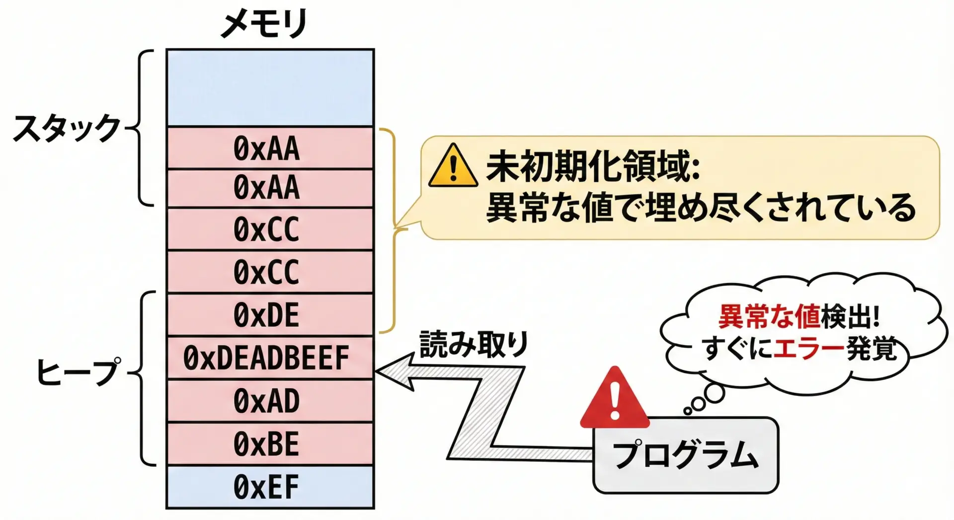 このように、わざと「異常な値」を入れておくことで、未初期化利用を早期に炙り出せます。