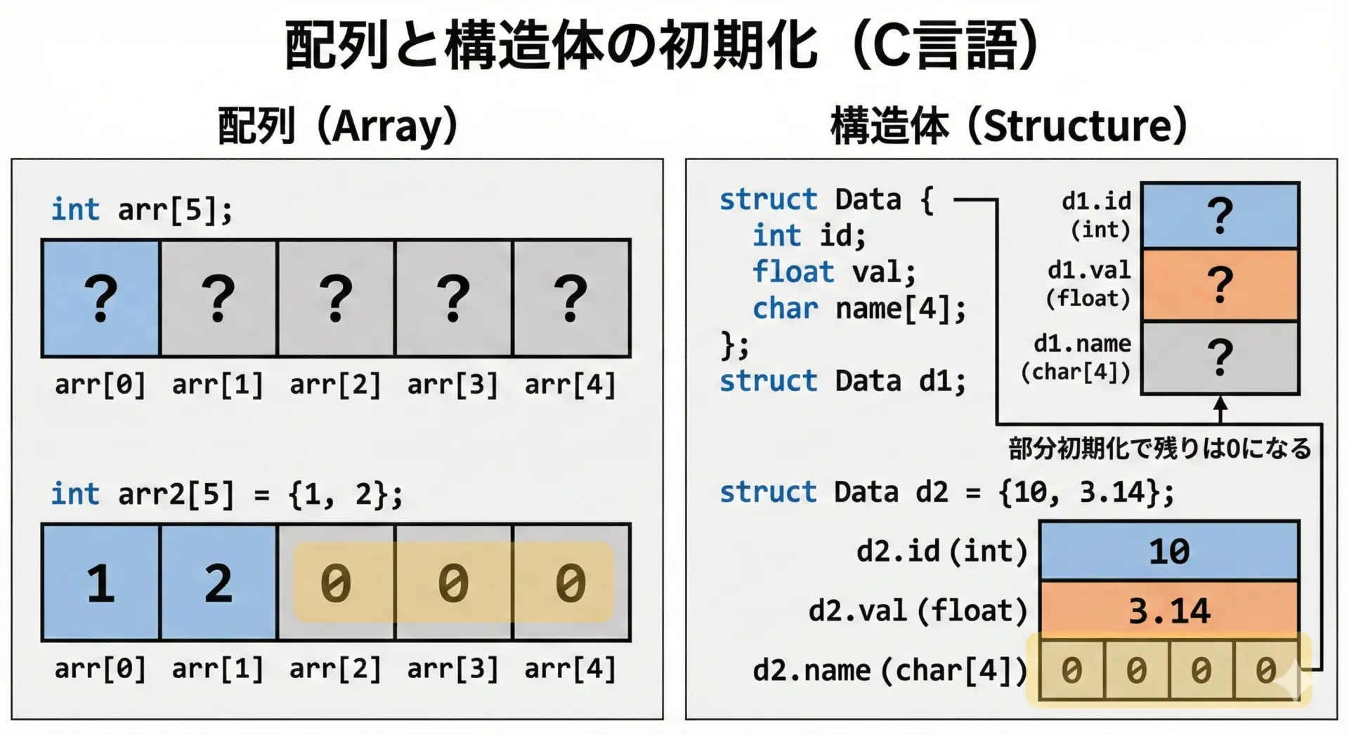 本記事では、C言語仕様に基づいて未初期化変数の挙動を整理し、典型的なバグ例や防止策まで、図解とサンプルコードを交えて丁寧に解説します。