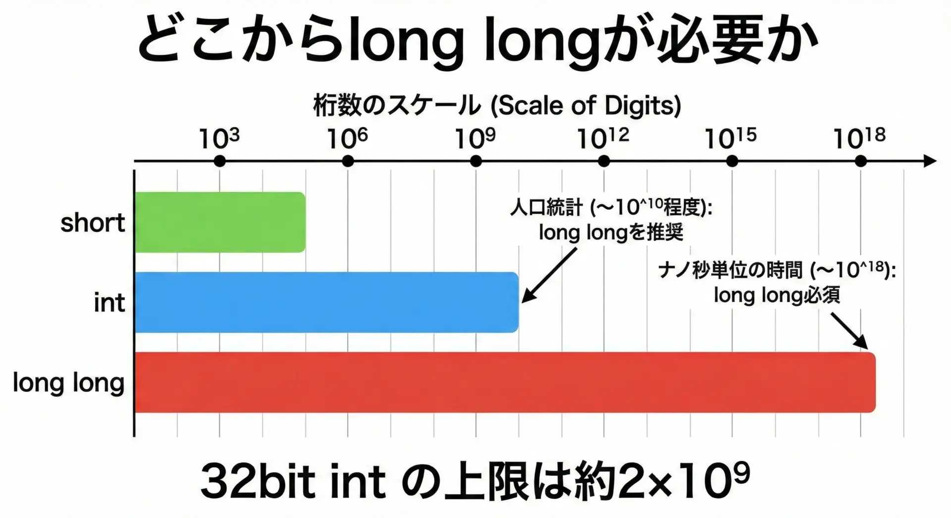 「とても大きな整数が必要なら、とりあえずlong long」と覚えておくと実務では安心です。