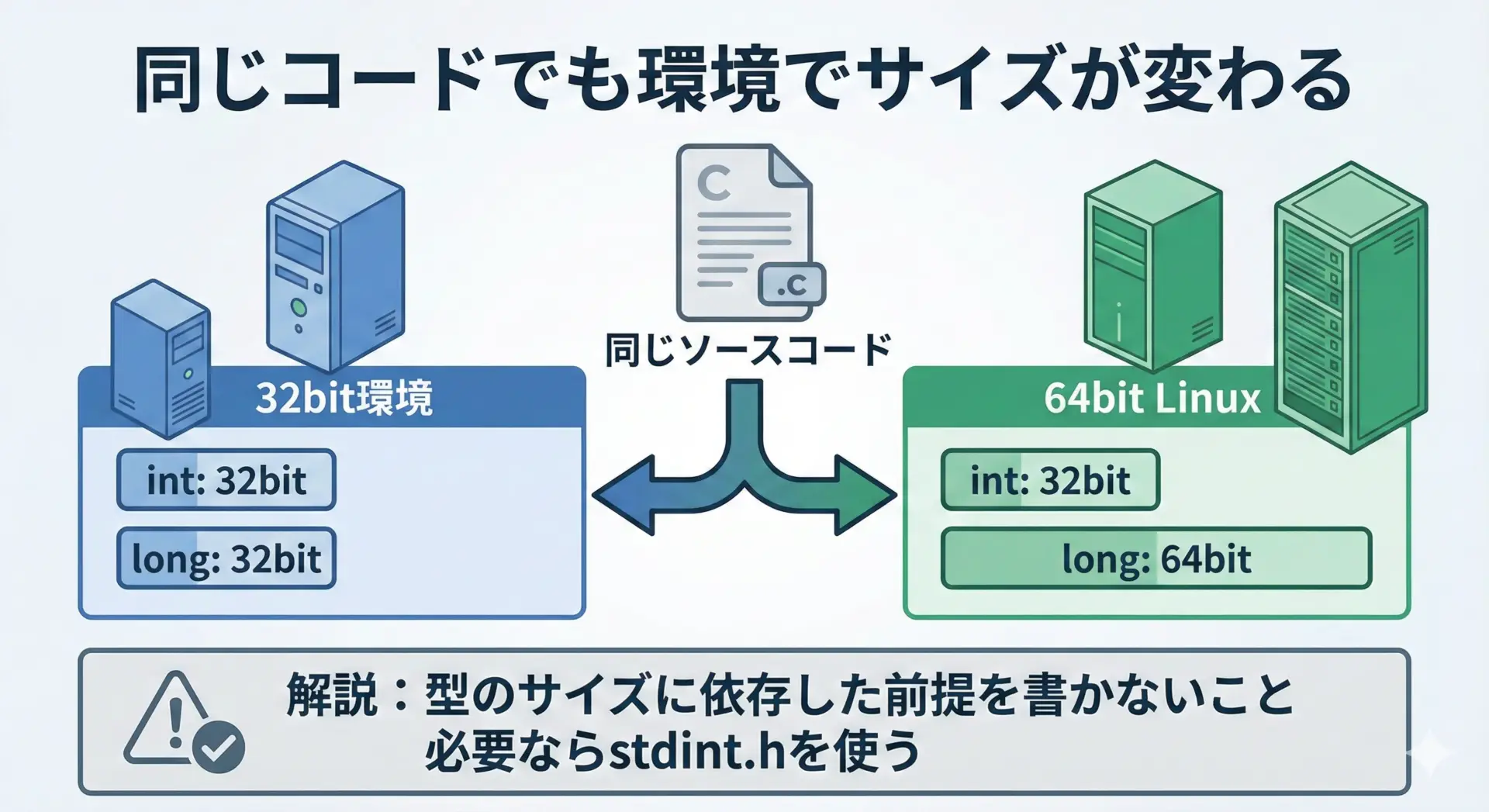 この違いが、「同じCコードでも、OSを変えると型のサイズが変わる」というややこしさの原因です。