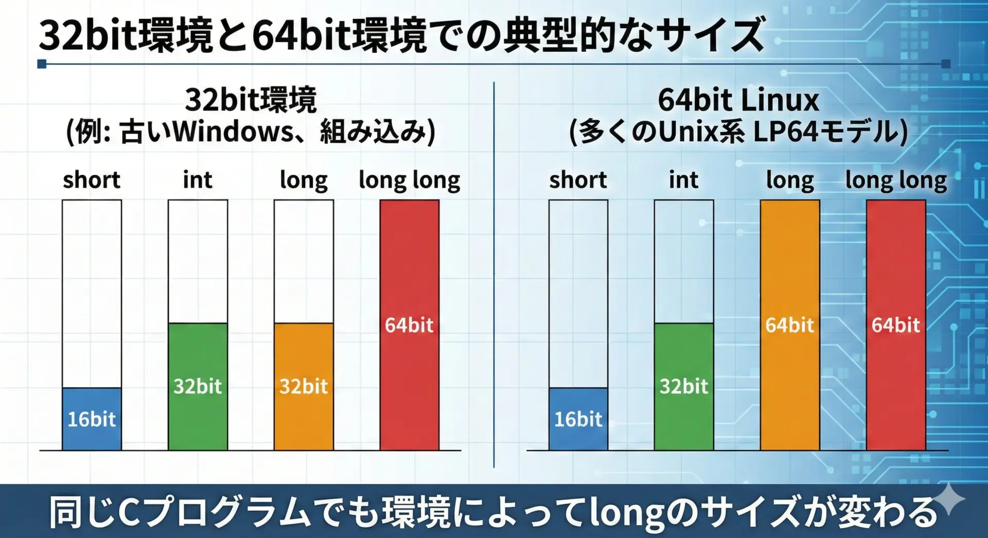 ここで重要なのは、これらのサイズ(ビット数)が「どの環境でも同じ」とは限らないという点です。