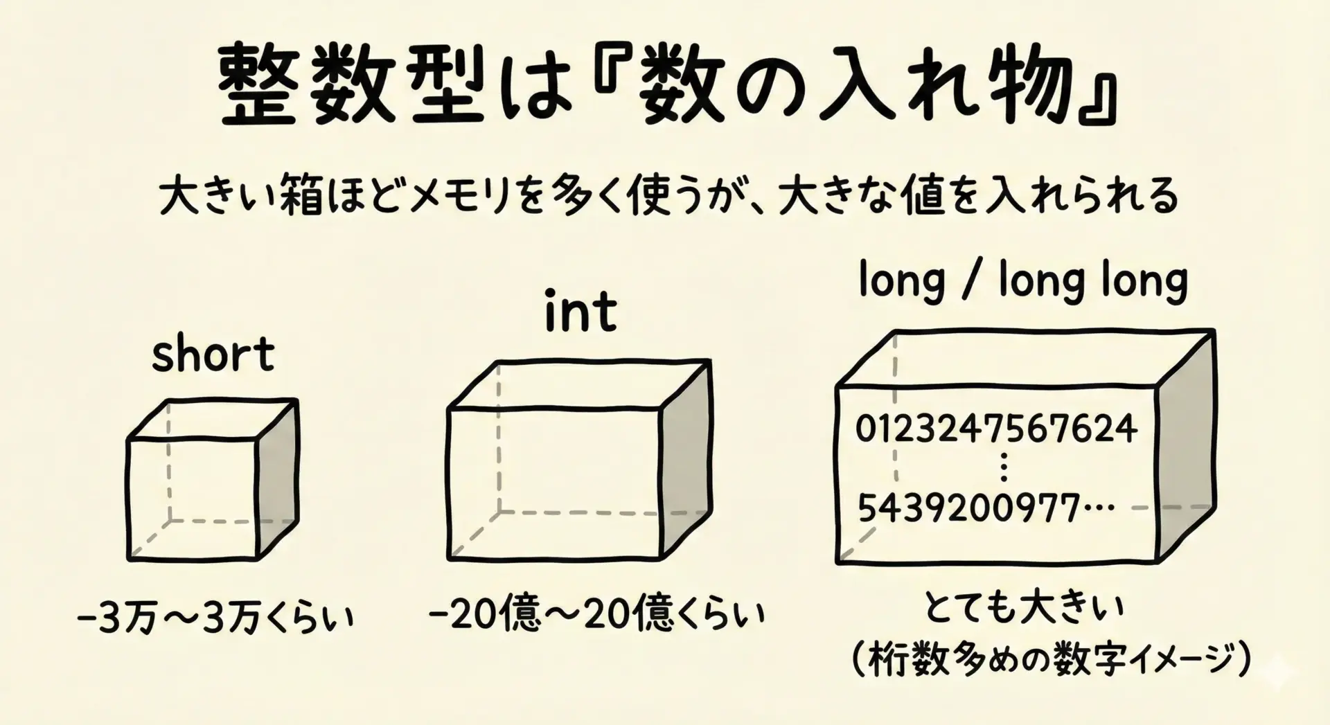int / short / longの違いは、主に「箱の大きさ」と「扱う範囲」の違いだとイメージすると理解しやすくなります。