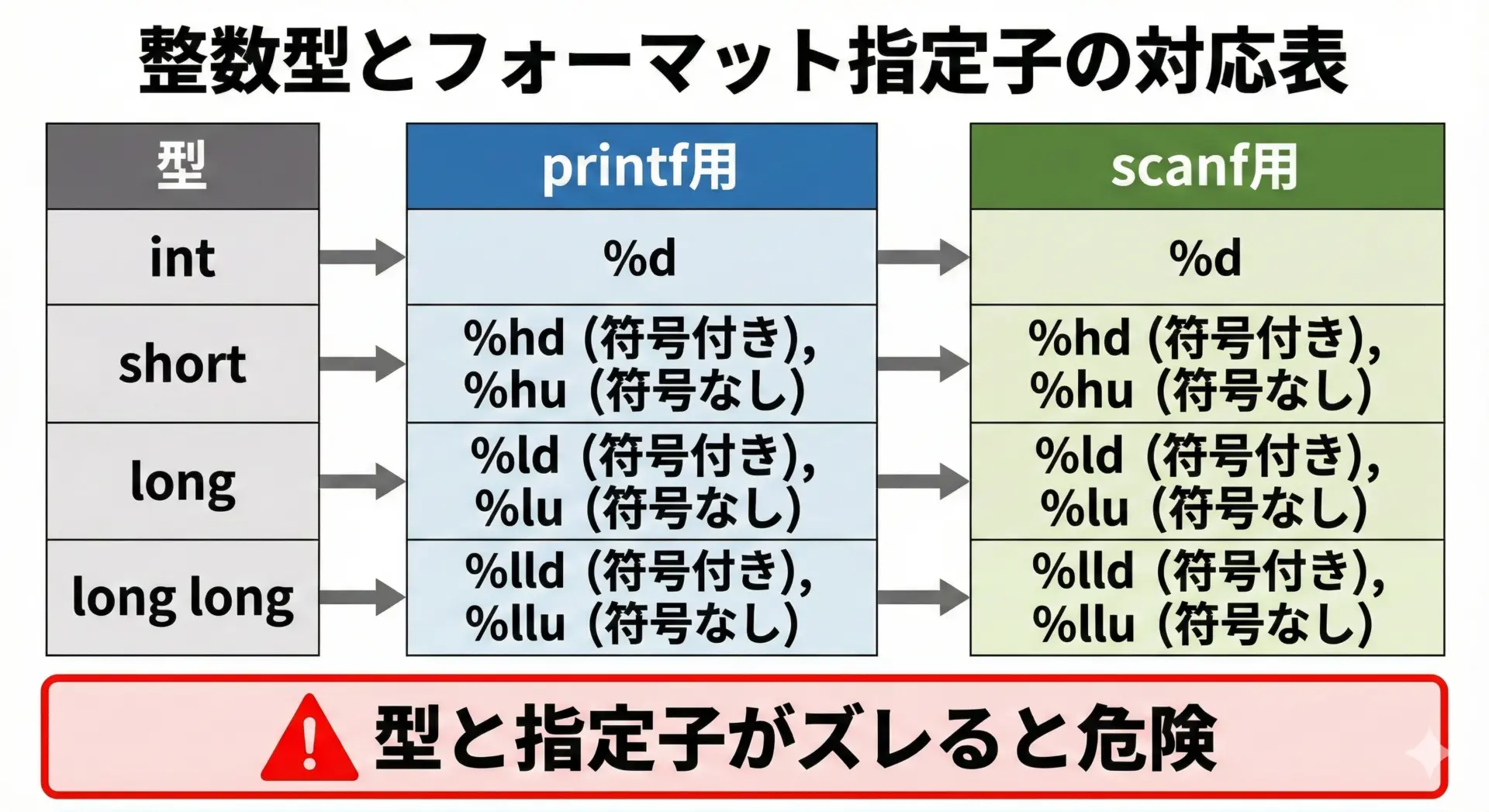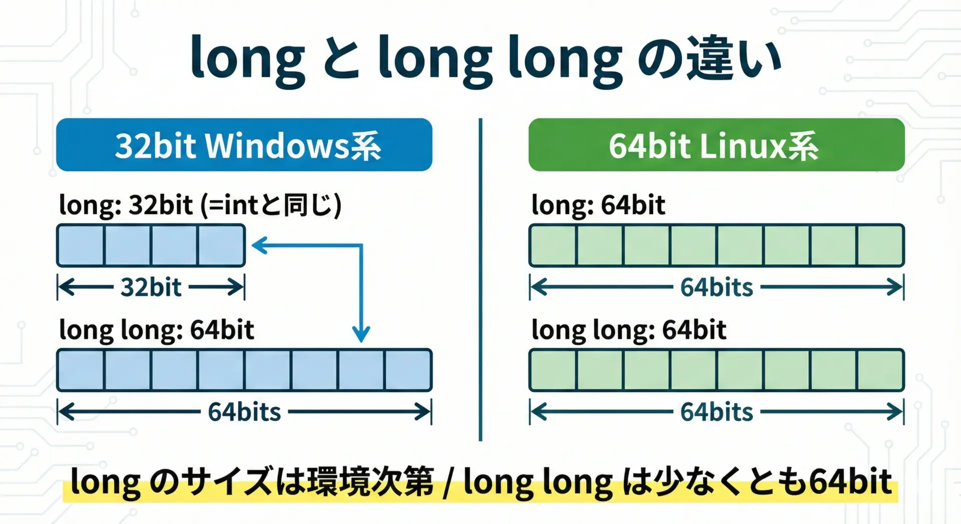 一方、long long型は「少なくとも64ビット」であることがC99以降で保証されており、大きな整数を扱いたいときに安心して使える型です。