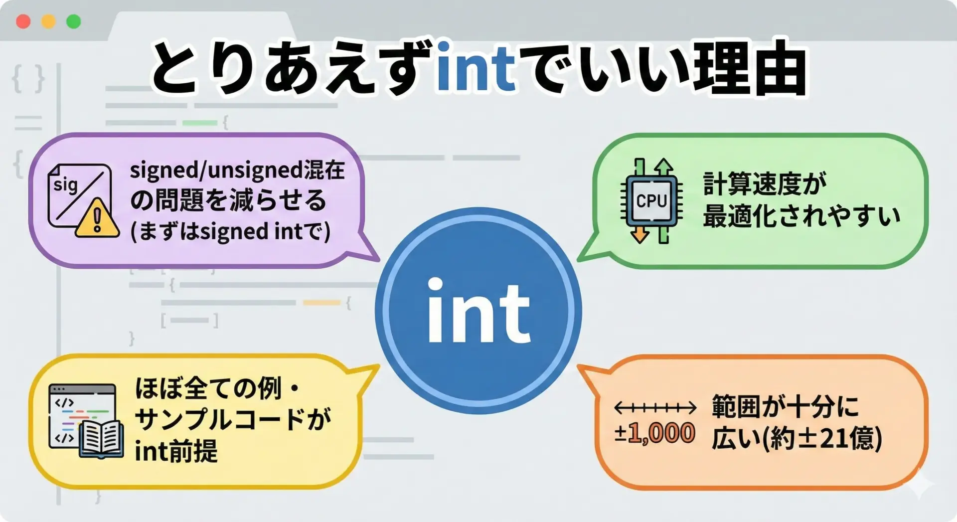 基本的には「特別な理由がなければint」、大きな値が必要ならlong long、ビット幅を固定したい場面ではstdint.hのint32_tなどを使う、という方針で考えると整理しやすくなります。