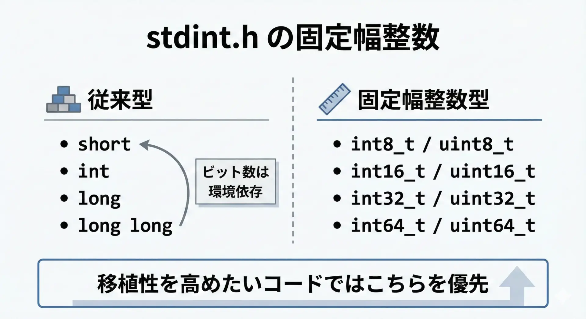 - ビット数が重要な場面では、固定幅整数型(int32_tなど)を使う