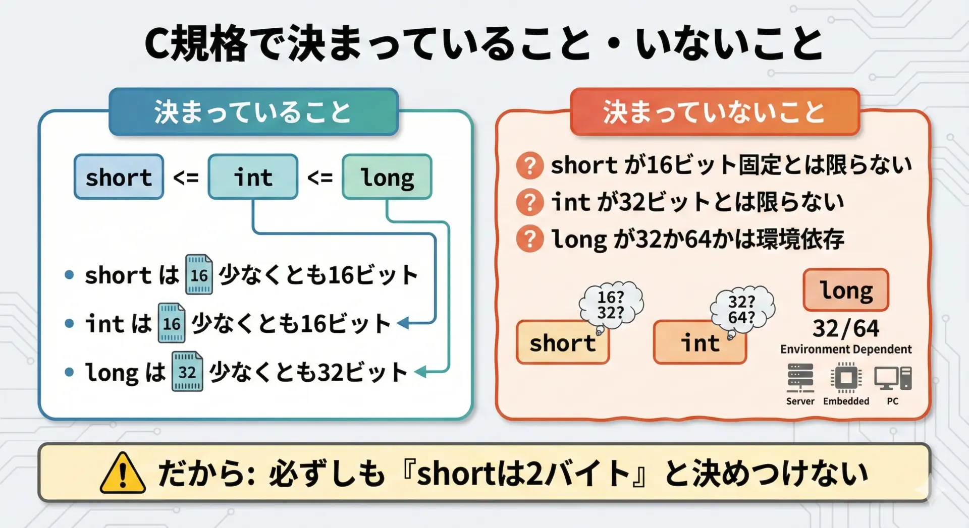 intが32ビットとは限らない(16ビットや64ビットも理屈上あり得る)longが32ビットか64ビットかは環境に依存するshortのサイズも環境依存(ただし16ビット以上)