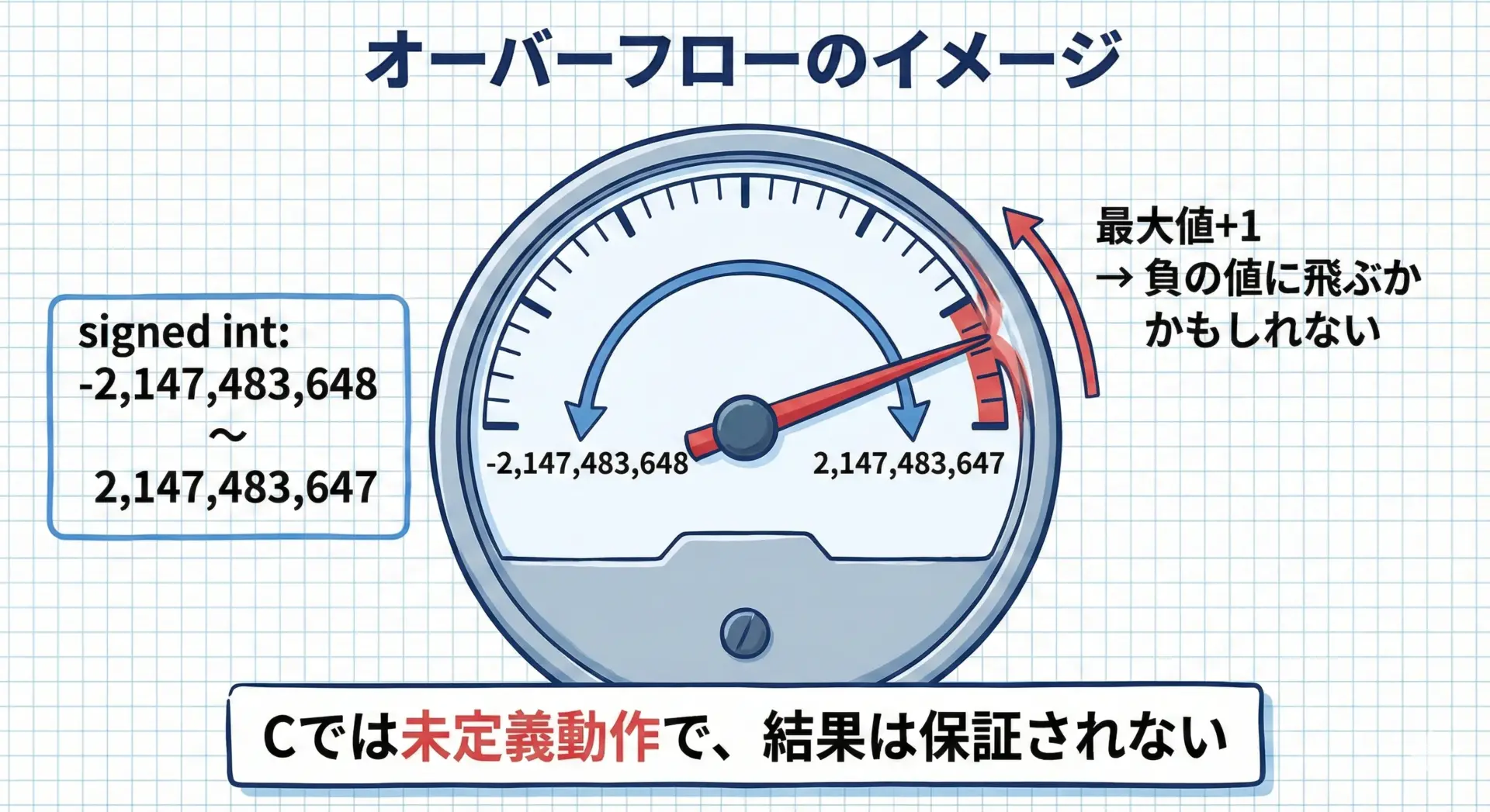 オーバーフロー(桁あふれ)は、整数型の範囲を超える値を扱ったときに発生する現象です。