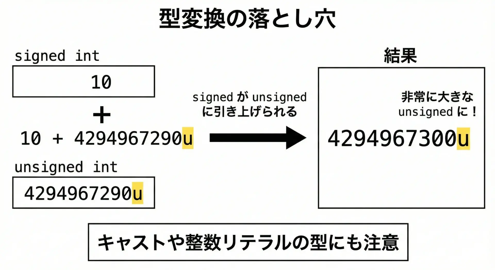 一見a = -1なのでa < bに見えますが、実際にはaがunsignedに変換されて非常に大きな値になり、条件が逆転してしまいます。