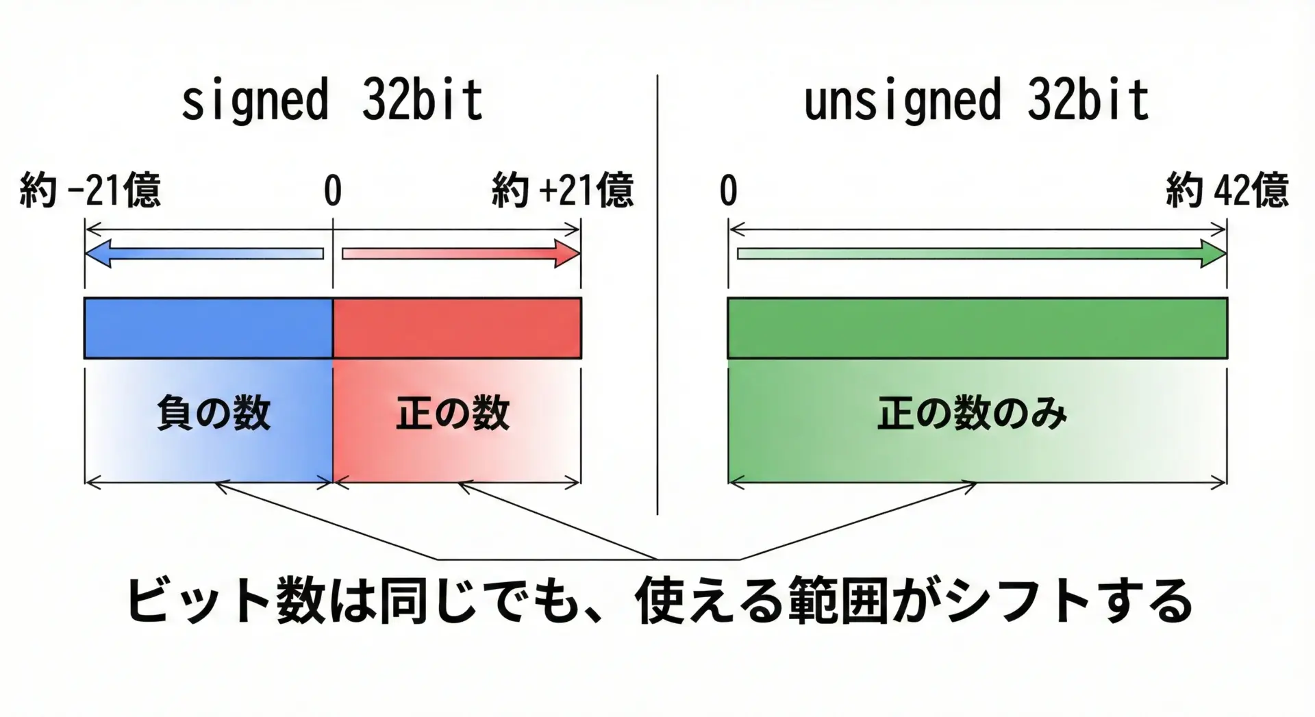 signedかunsignedかで、扱える範囲が大きく変わることも重要です。