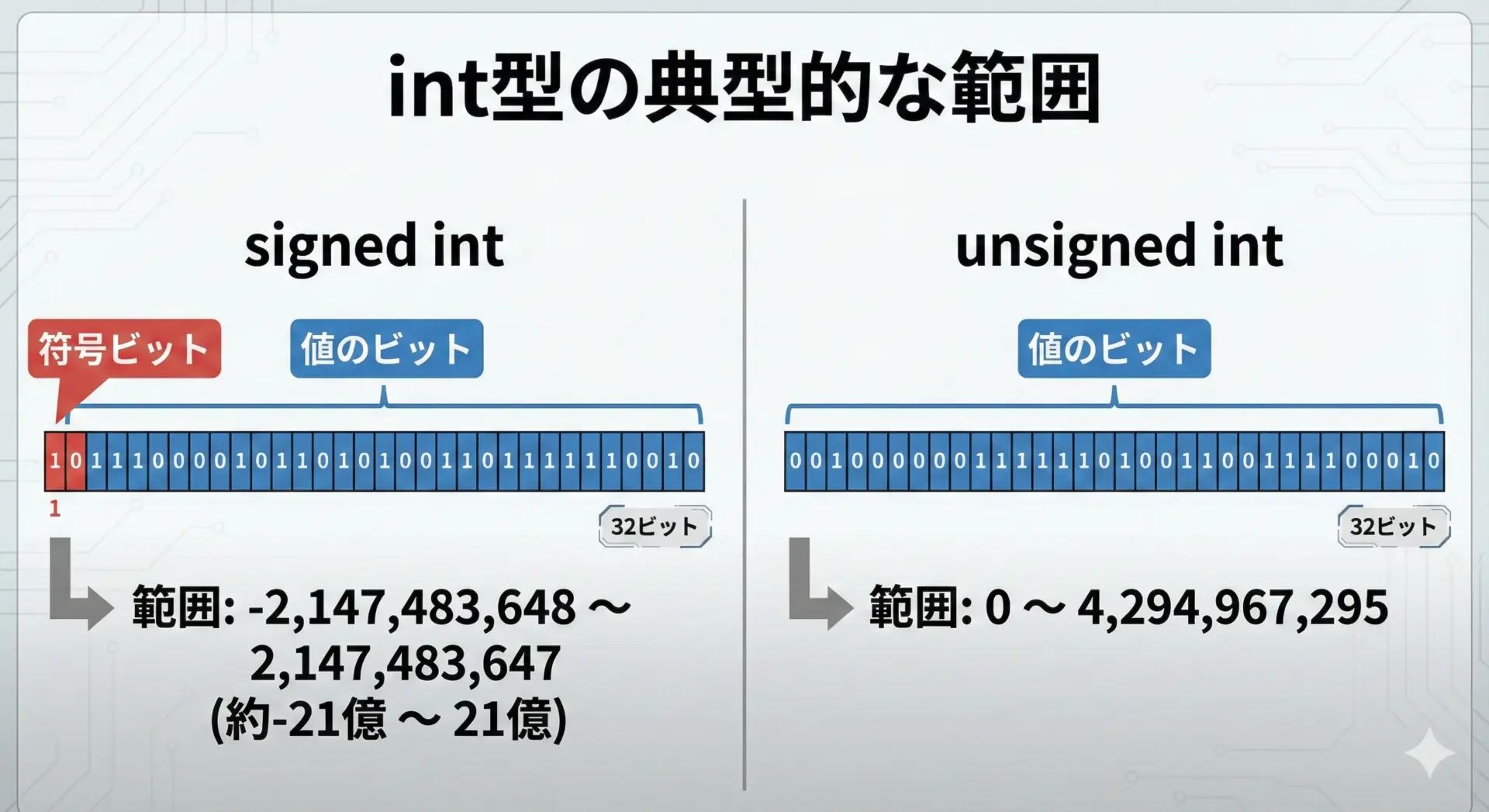 - 32ビットintなら約±21億まで扱えるため、日常的な数値には十分