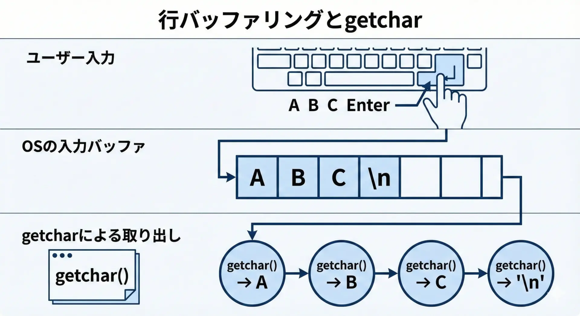 このプログラムでは、ユーザーが1文字入力してEnterを押したタイミングで、getcharが文字を読み込みます。