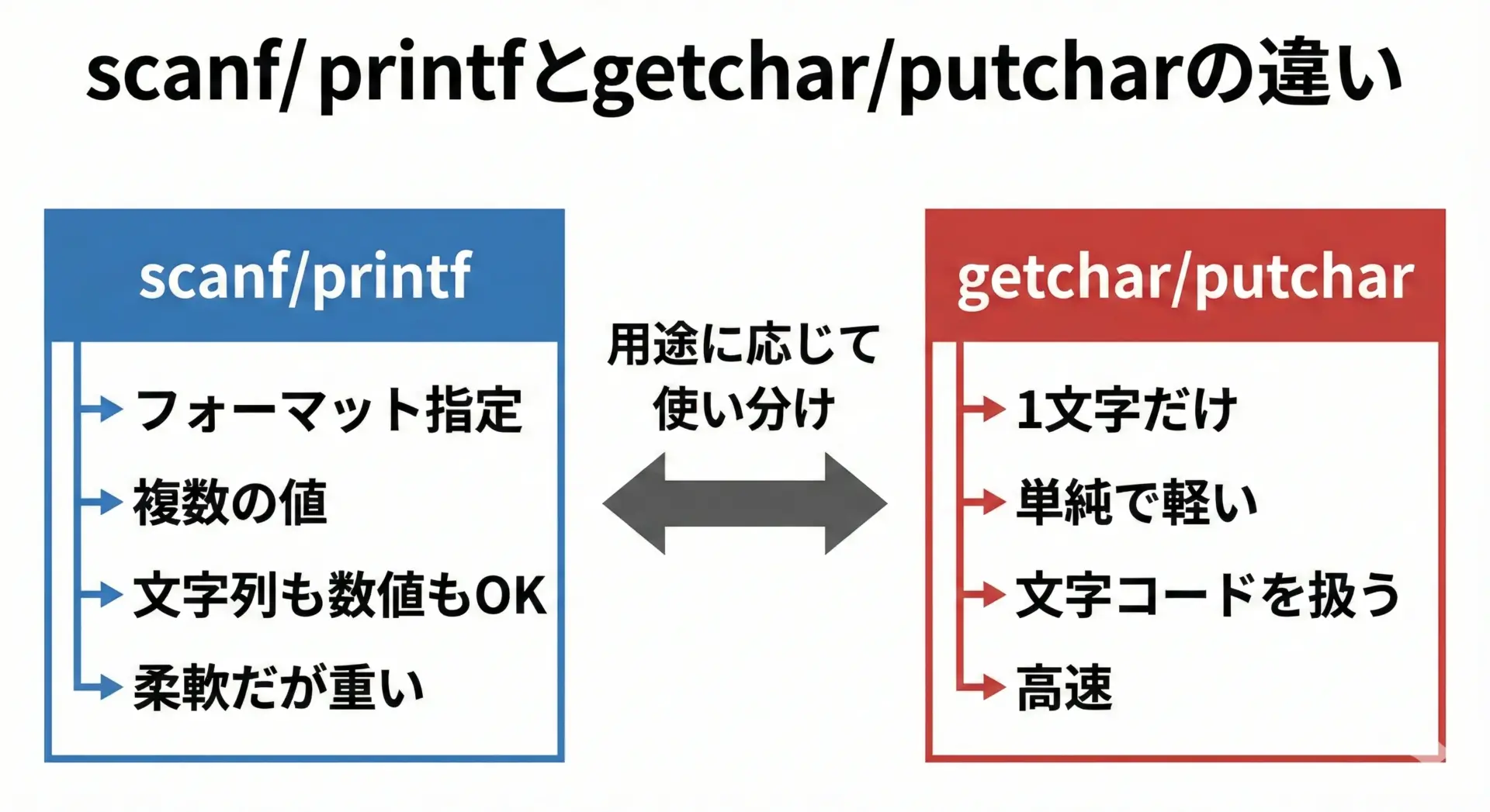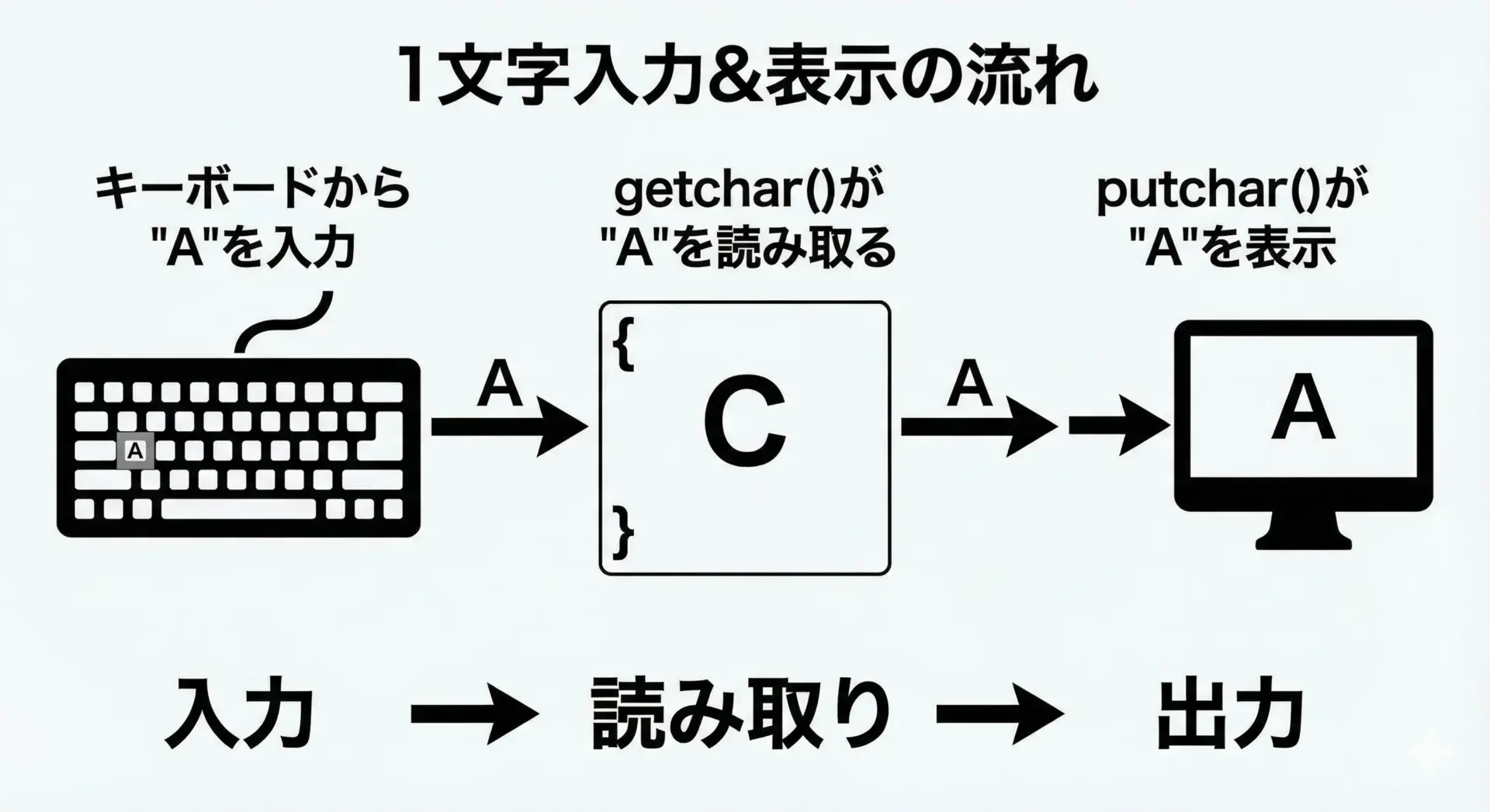 「1文字ずつ」というシンプルさが、getchar・putcharの最大のメリットです。