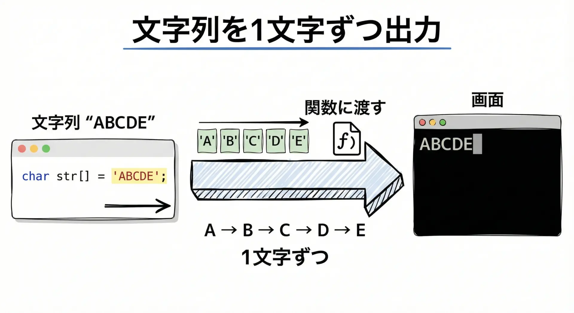 putcharを使えば、文字列も1文字ずつ順番に出力することができます。