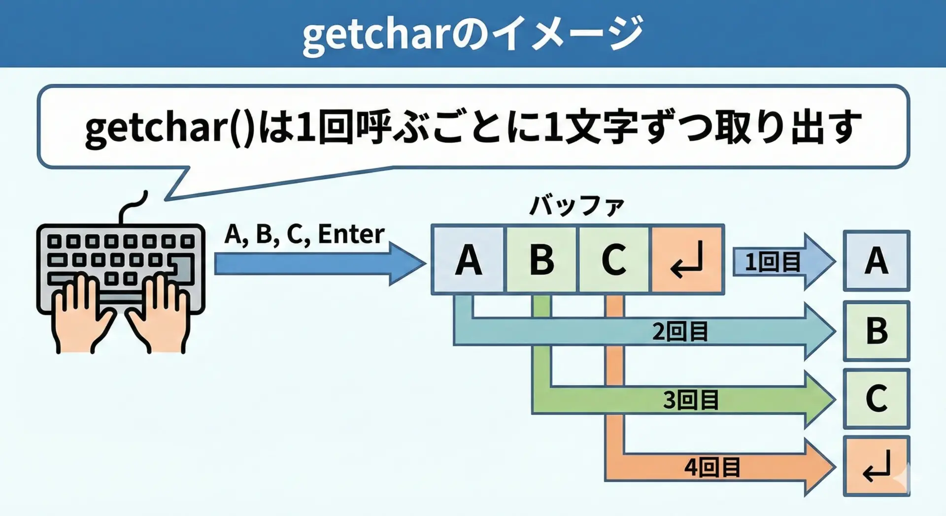 getcharは、標準入力(stdin)から1文字だけ読み取る関数です。