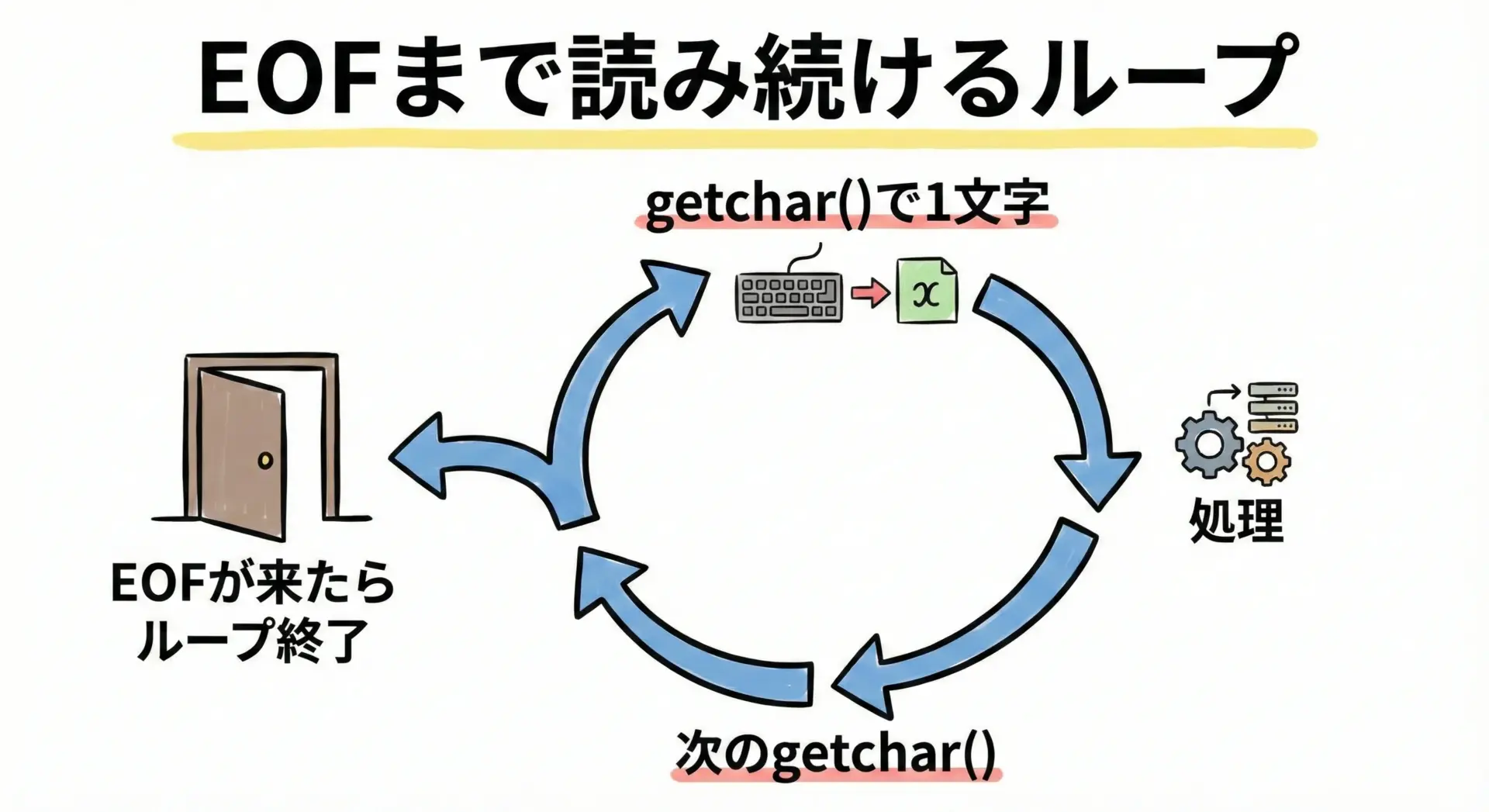 まずはEOFまで読み続ける定番ループwhile ((c = getchar()) != EOF)に慣れ、改行やバッファの挙動も意識しながら、実際に手を動かして試してみてください。