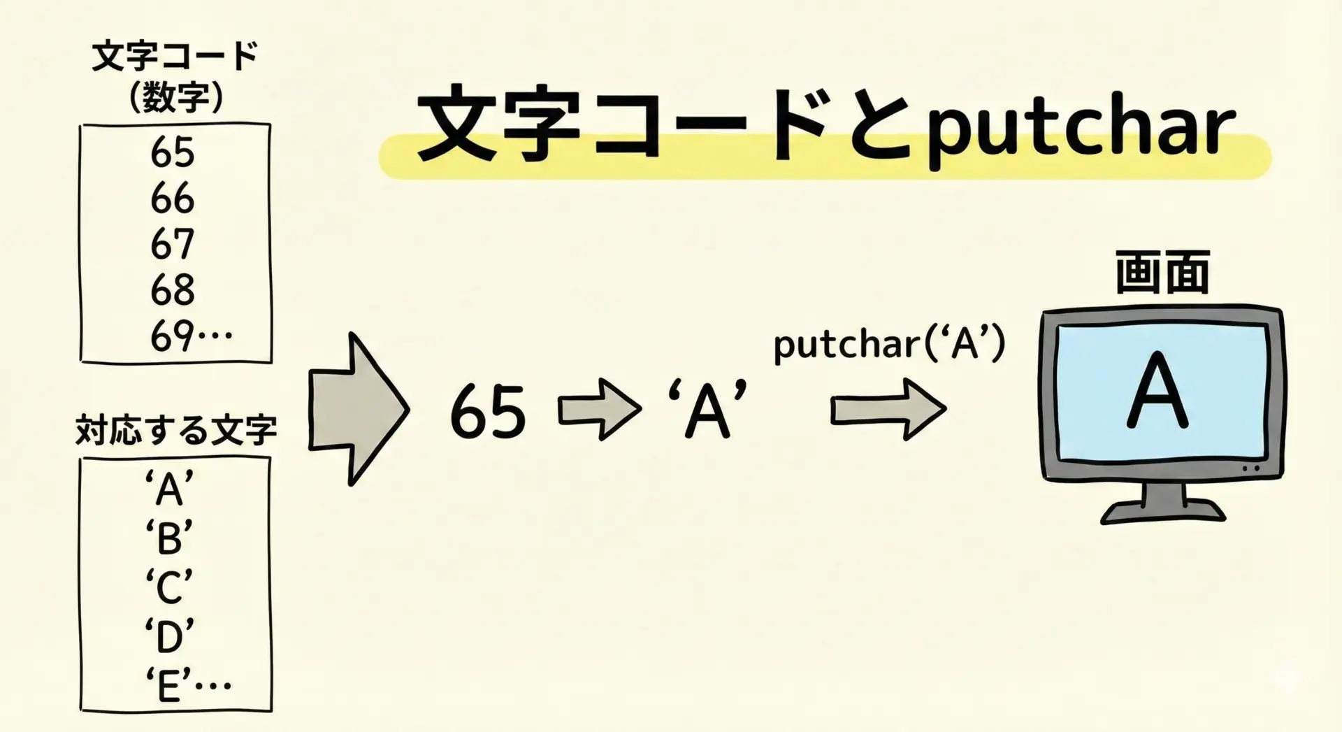 putcharは、この整数値を受け取り、その値に対応する文字を出力します。