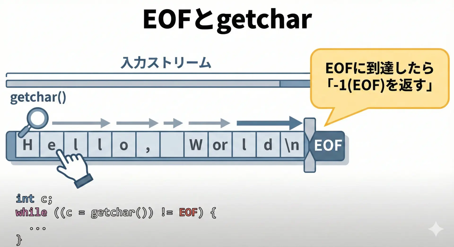 getcharは標準入力から1文字をint型として読み取り、EOFとの比較で入力の終わりを検出します。