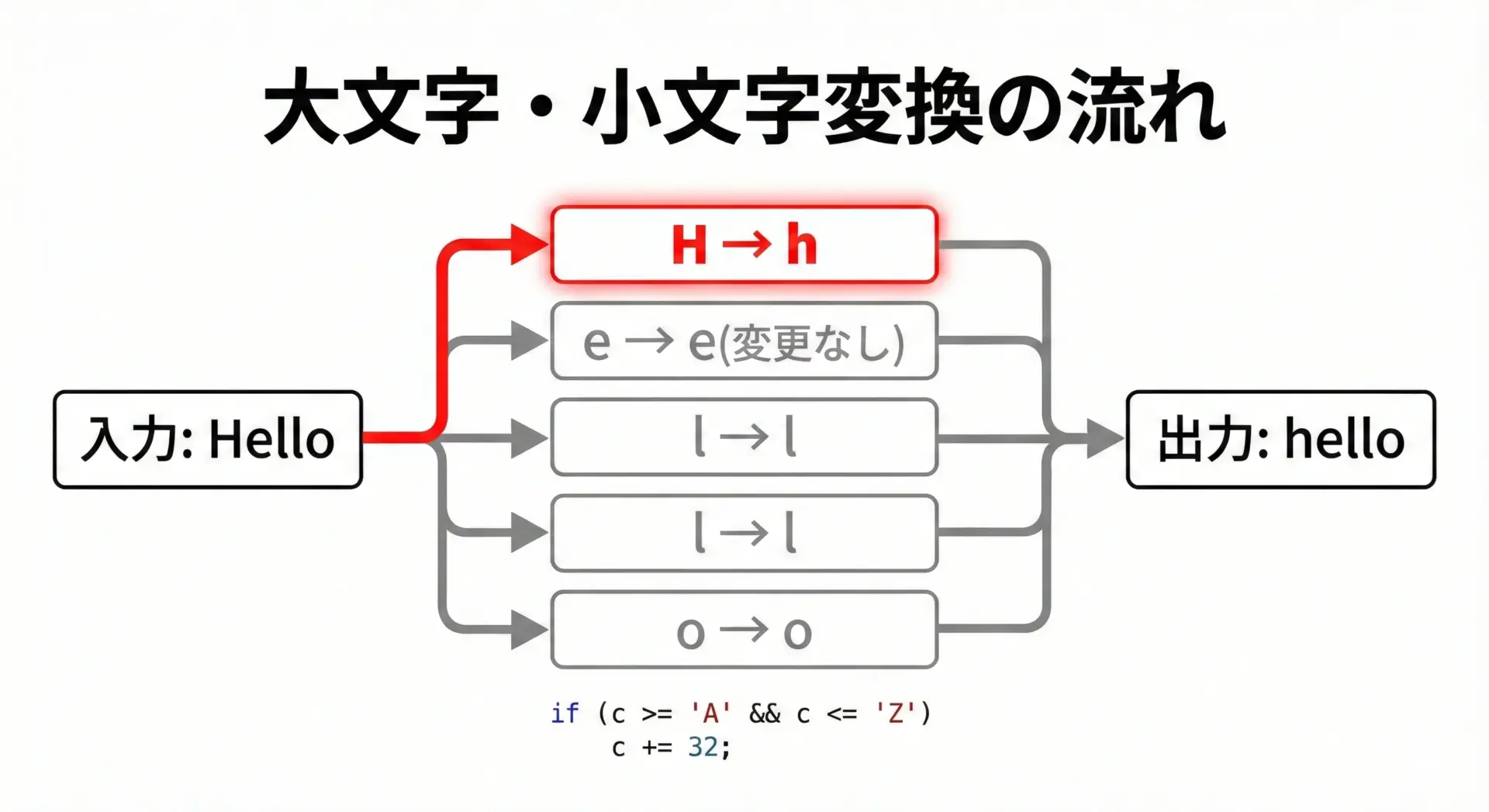 より可搬性を高めるにはtolower関数(ヘッダ<ctype.h>)を使う方法もありますが、getchar・putcharの理解という観点では、あえて自前で変換してみると文字コードへの理解が深まります。