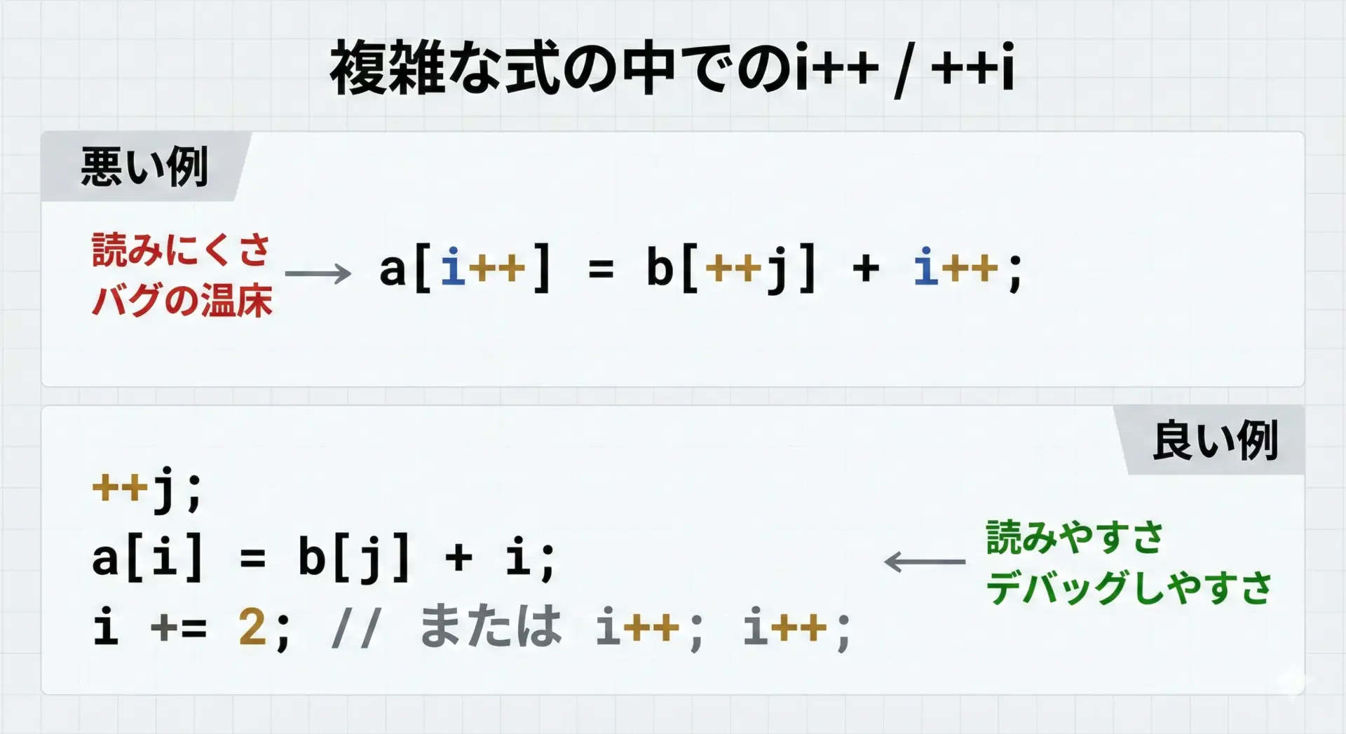安全に使うためには、単独文で使う・同じ式で同じ変数を何度も変更しない・複雑な式に埋め込まないという基本を守り、チームでスタイルを統一することが重要です。