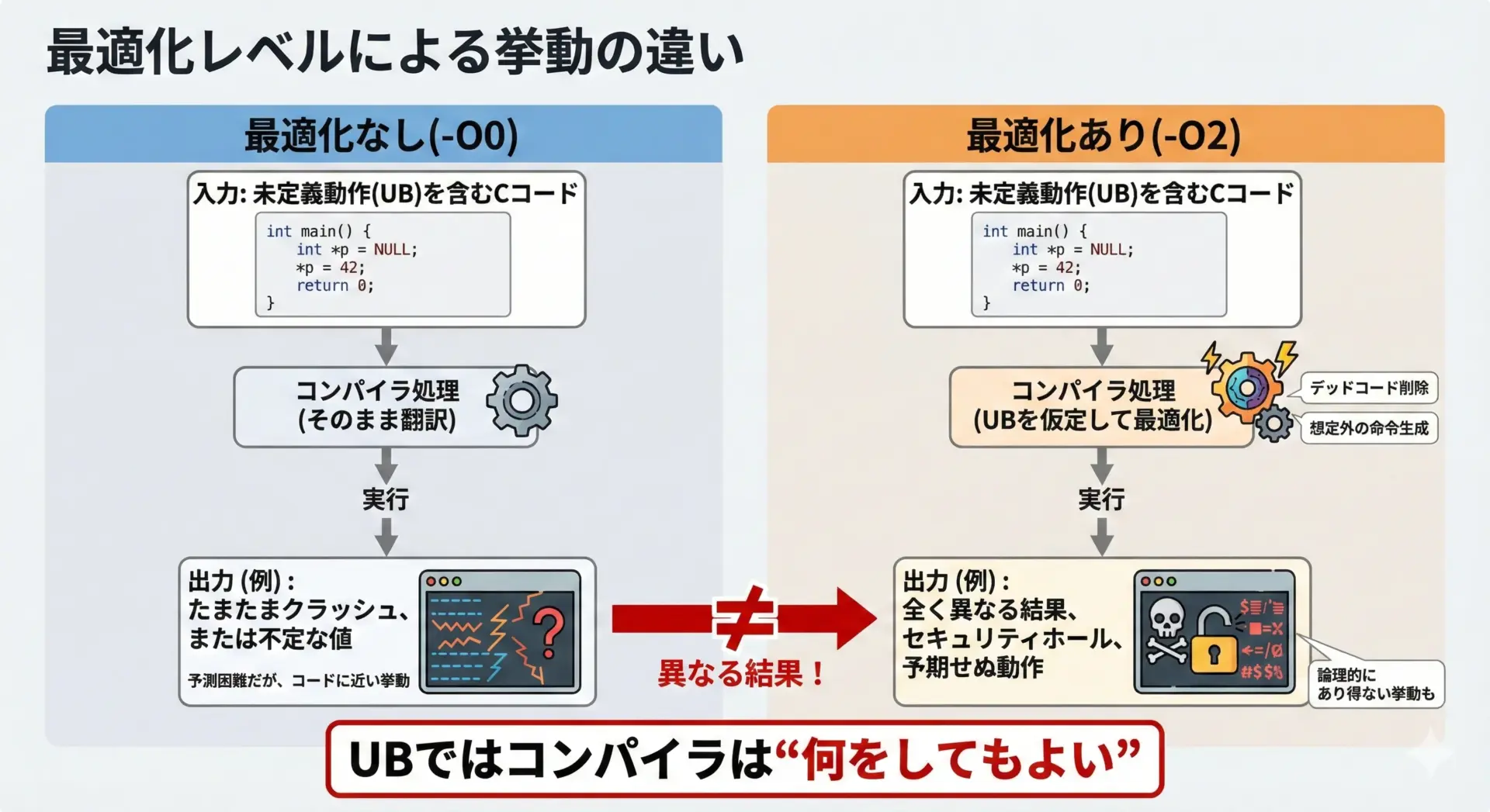 このように実際の実行結果がバラバラになる可能性があること自体が、未定義動作の恐ろしさです。