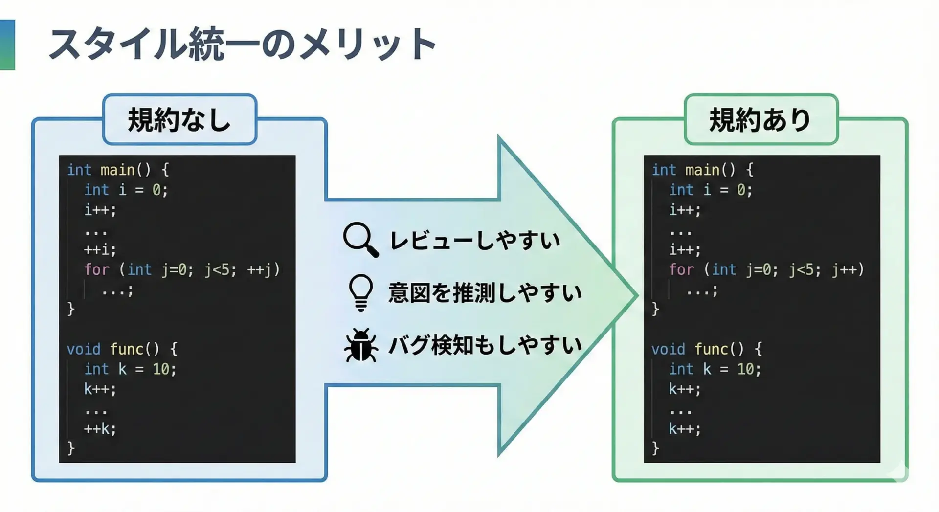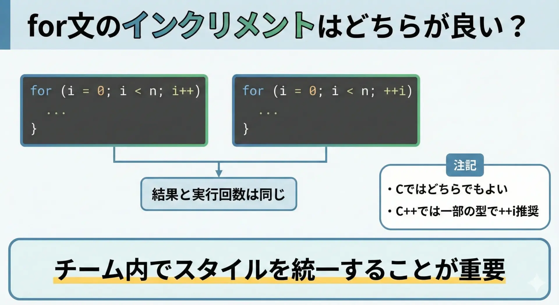 このようにルールを明確にしておくと、コードレビューの際に「この++iには何か特別な意味があるのか?」といった余計な疑問を減らせます。