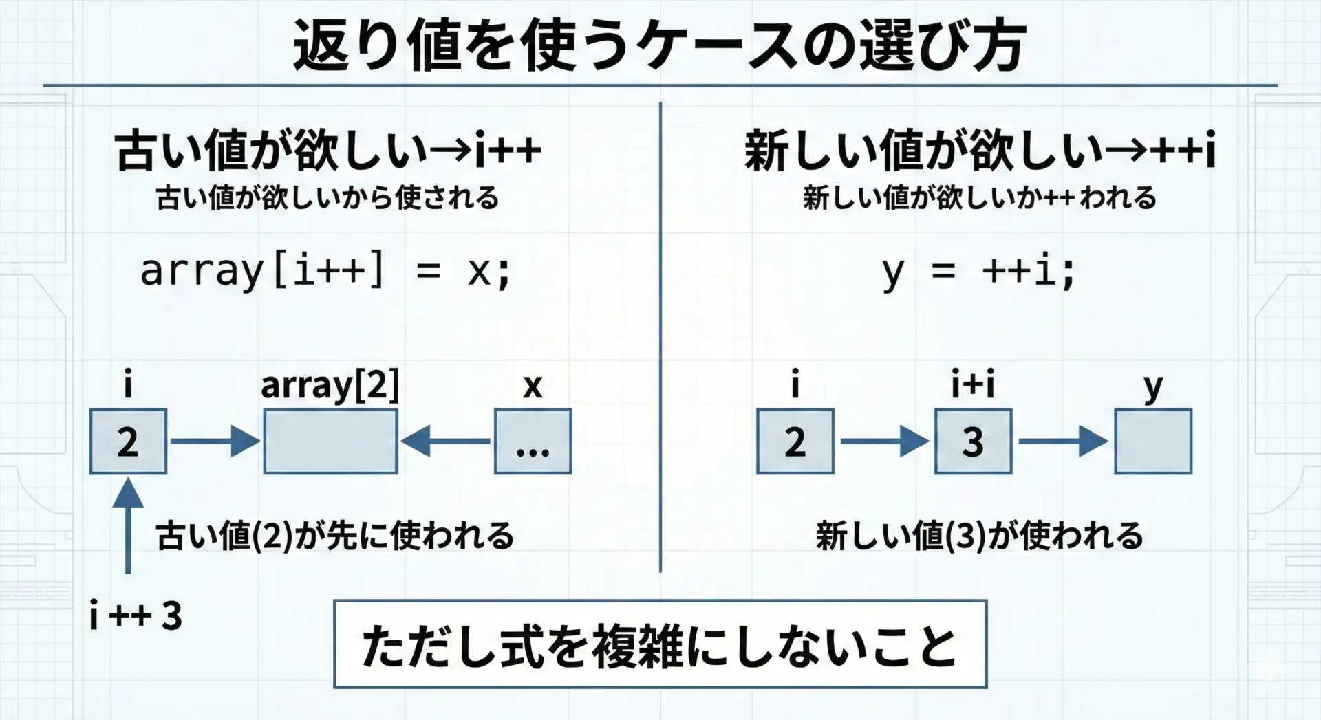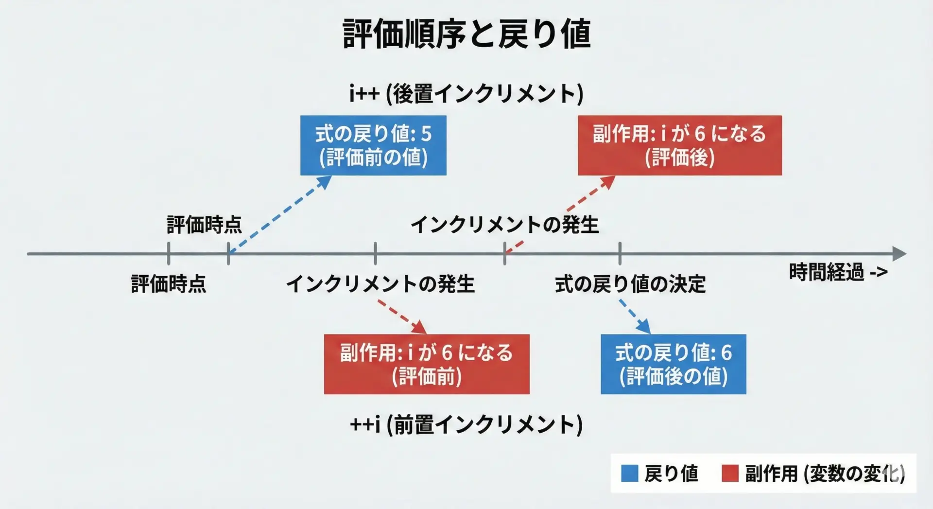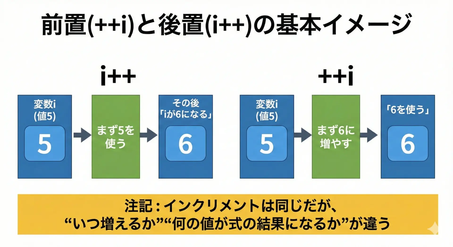 どちらも最終的にはiが1増えますが、「式として評価されたときに返ってくる値」が異なることが、バグの原因になりやすい重要ポイントです。