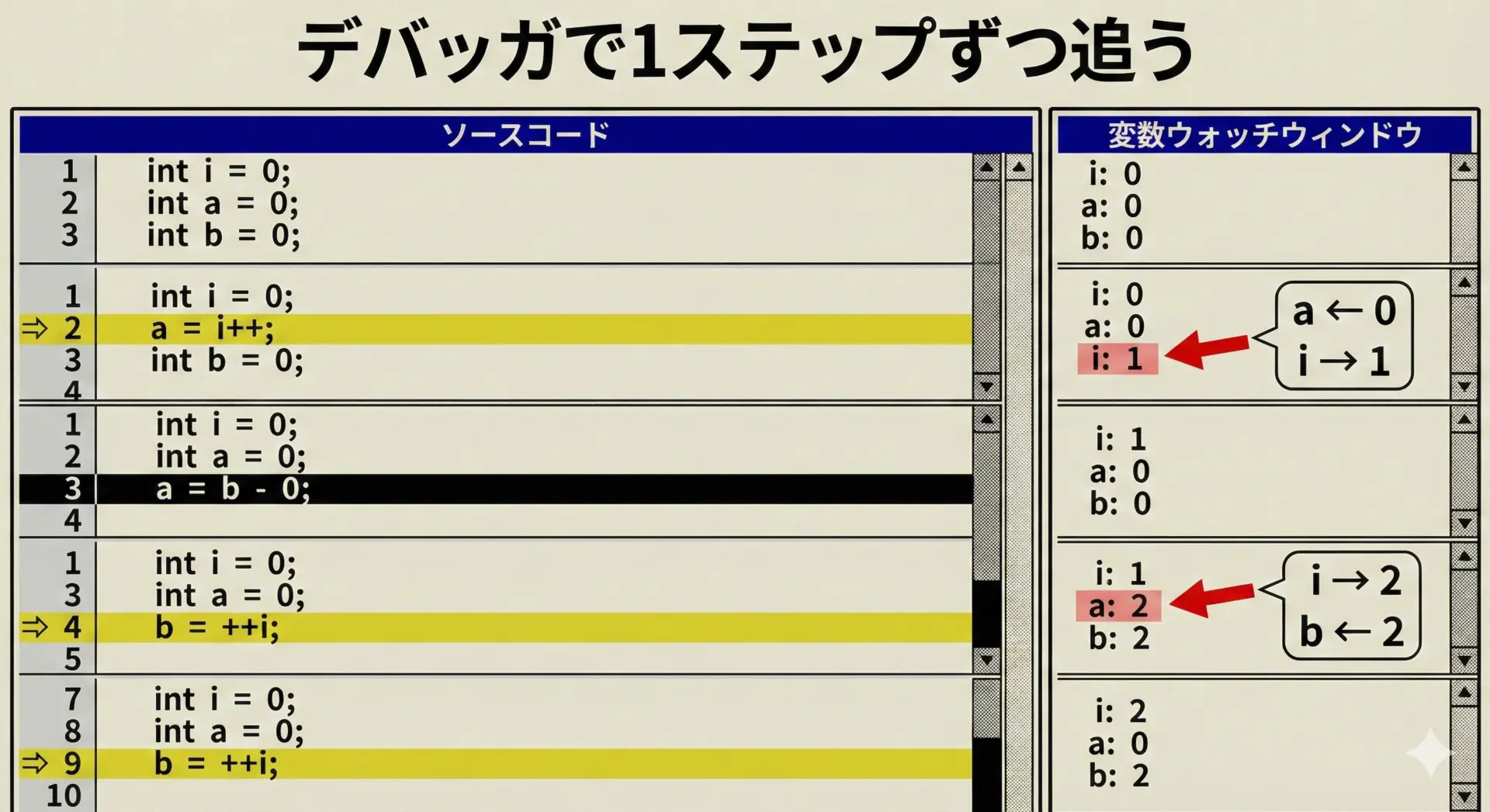 概念だけでなく実際の挙動を目で見ると、前置/後置インクリメントの理解が一段と深まります。