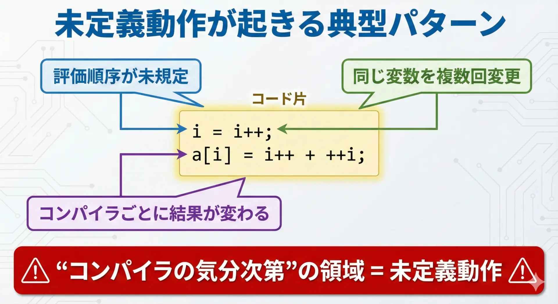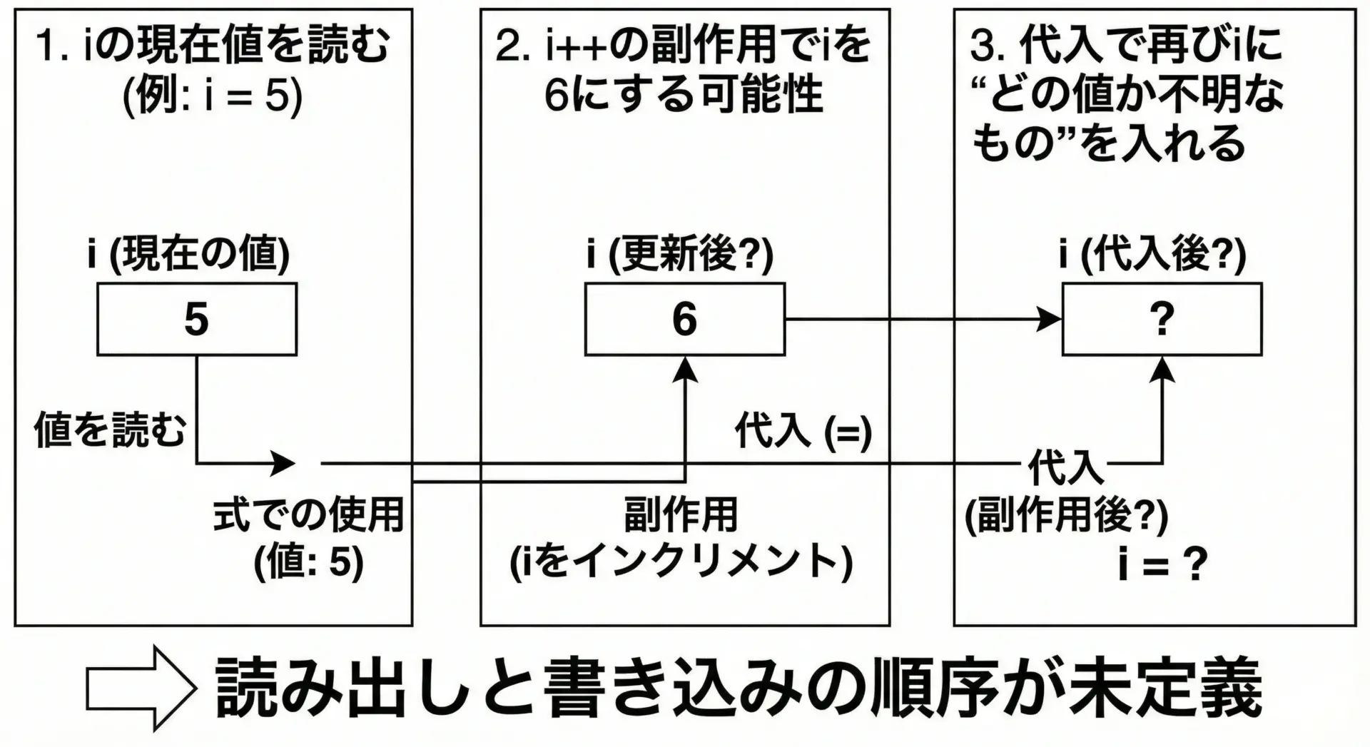 そのため、「同じ変数を、1つの式の中で複数回変更し、その間に“値を読む”操作も行う」と、未定義動作(Undefined Behavior, UB)を引き起こします。