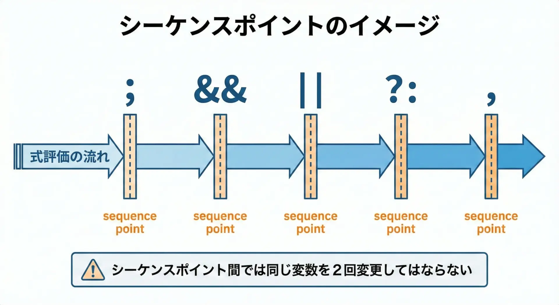 現在のC11/C17規格では「シーケンスポイント」という用語は廃止され、「評価順序・副作用の完了順序」としてより厳密に定義されていますが、実務では「シーケンスポイントの間で同じ変数を何度もいじらない」という古典的な覚え方の方が理解しやすい場合も多いです。