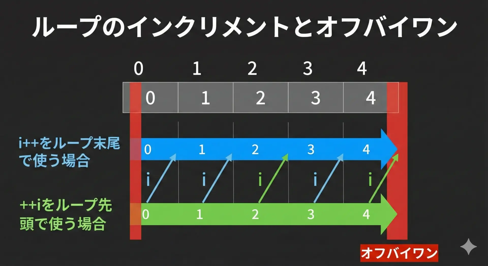 どちらも「1増やす」点は同じですが、式として返す値の違いが、未定義動作やオフバイワンエラーを招きやすいことを見てきました。