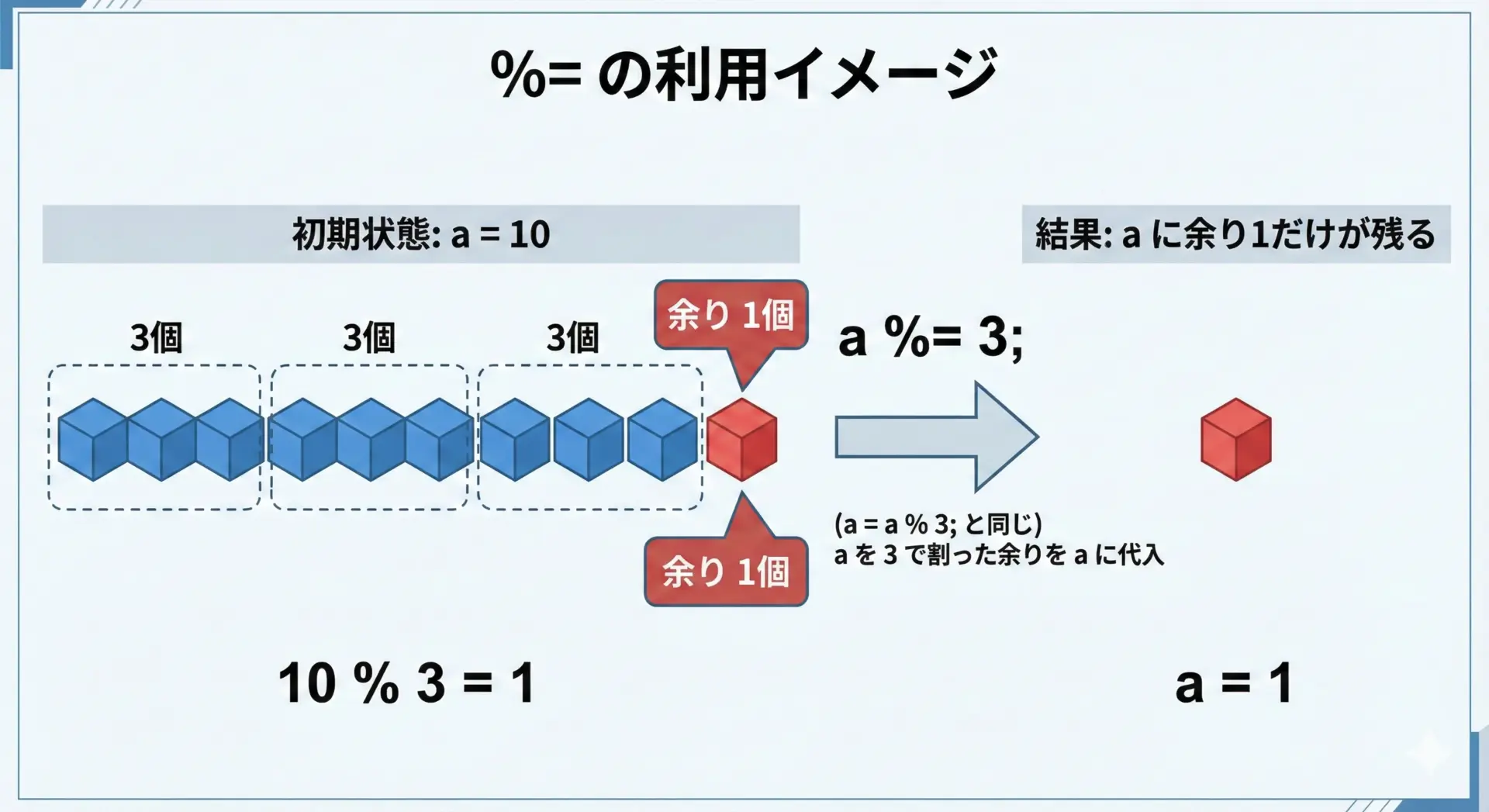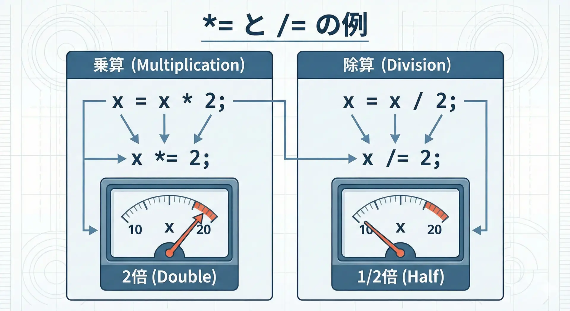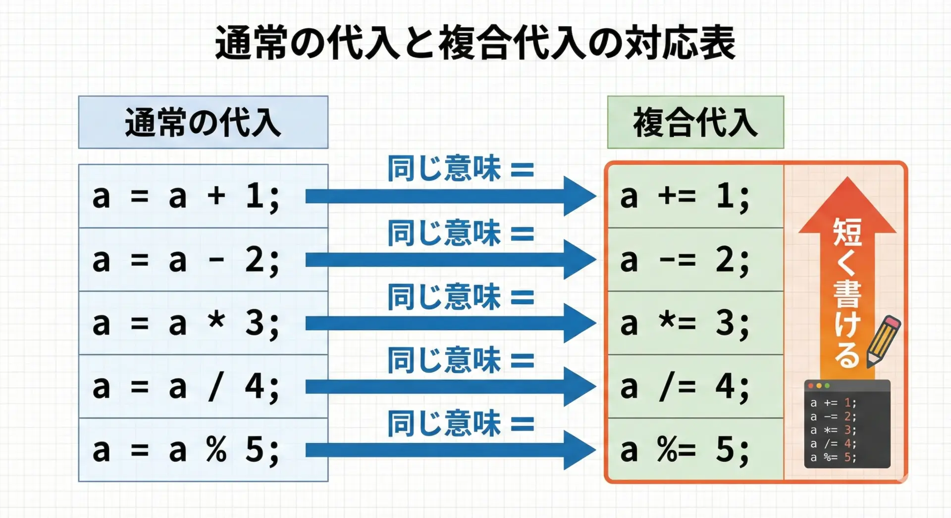 単純な=だけでなく、+=&=などの複合代入演算子を正しく使いこなすことで、コードを短く読みやすくできます。