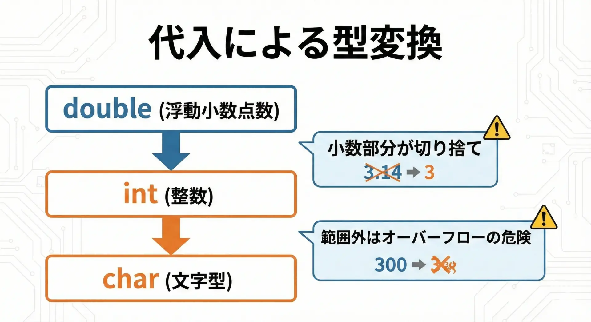 必要に応じて明示的なキャスト((int)(double))を記述し、意図した変換であることを示すと読みやすくなります。