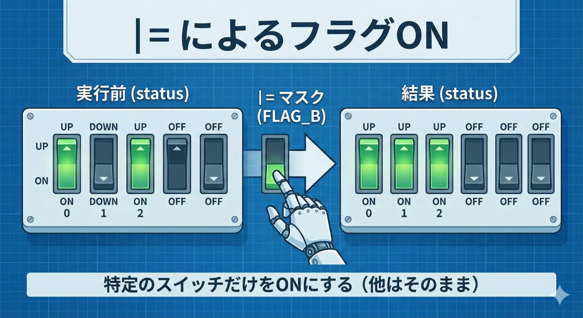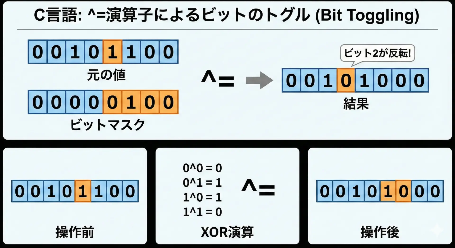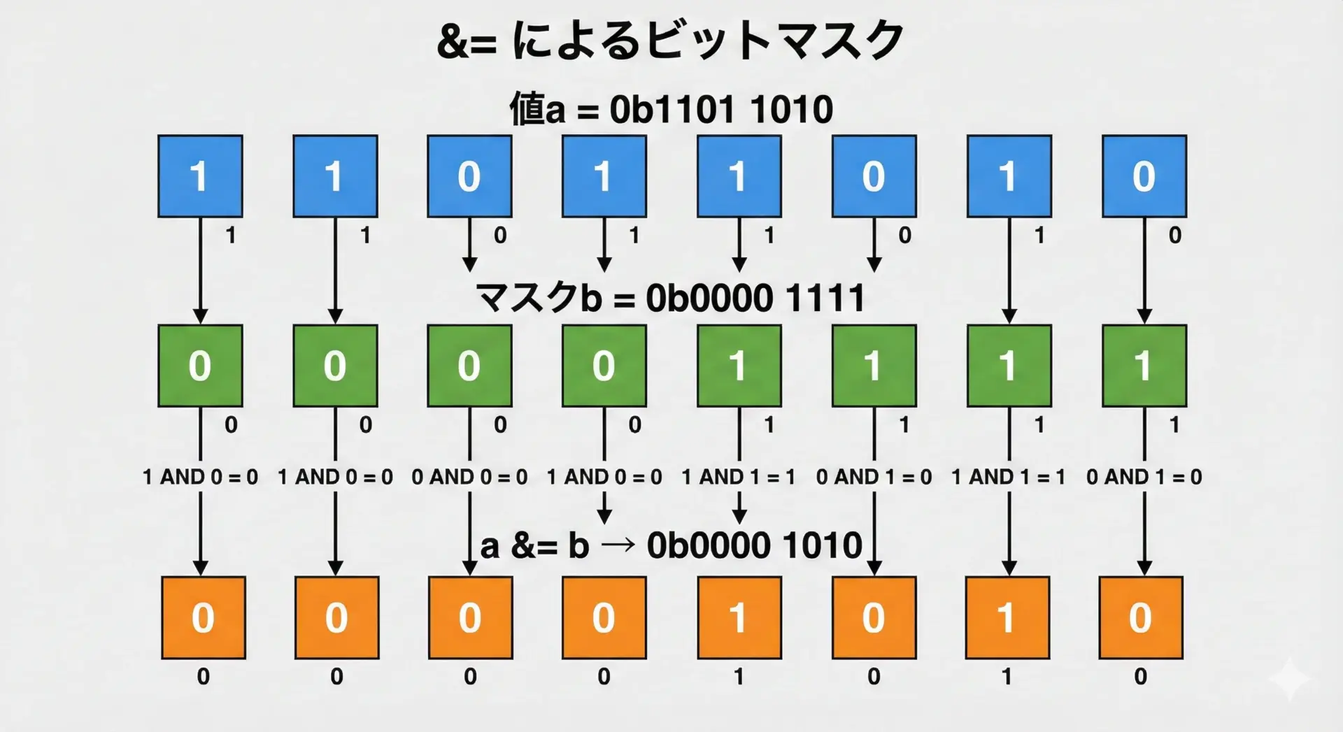 &=|=^=を使うときは、マスク値を間違えると意図しないビットまで変更してしまうことがあります。