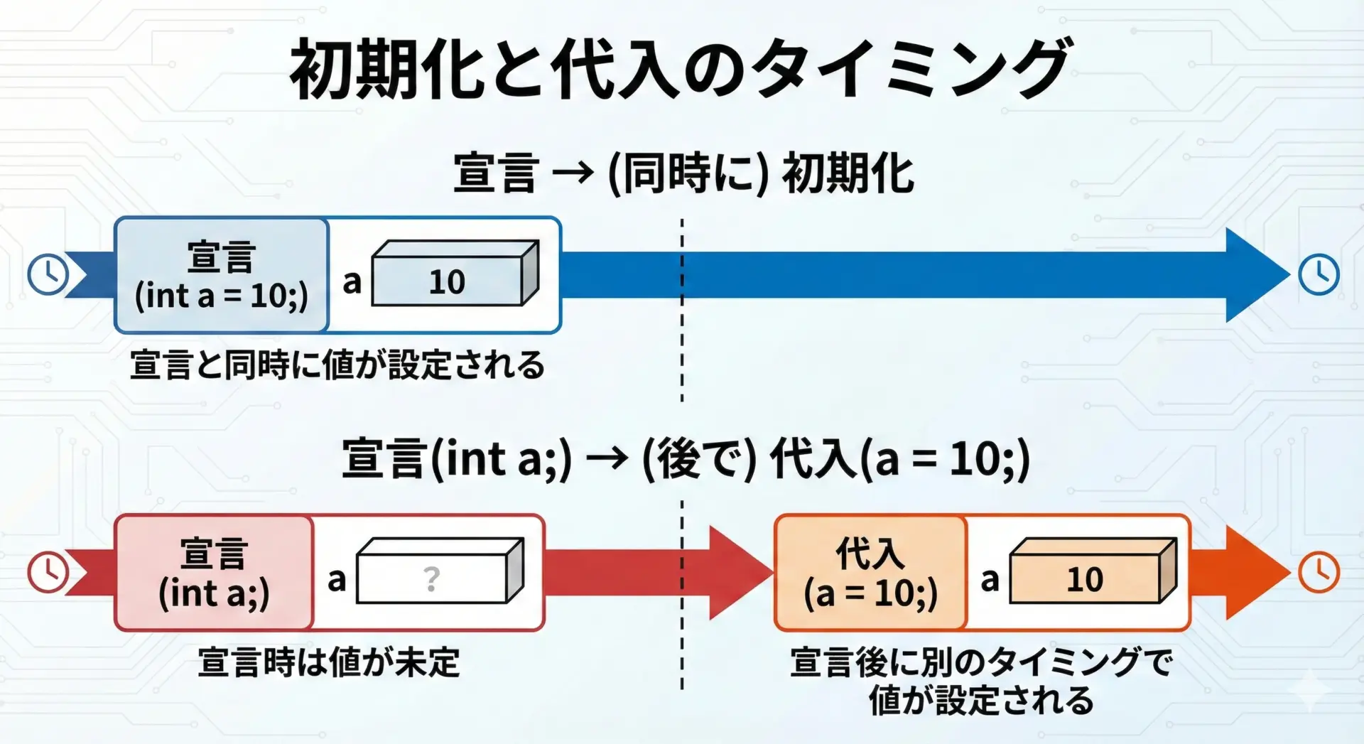 「代入」と「初期化」は似ていますが、C言語では意味が異なります