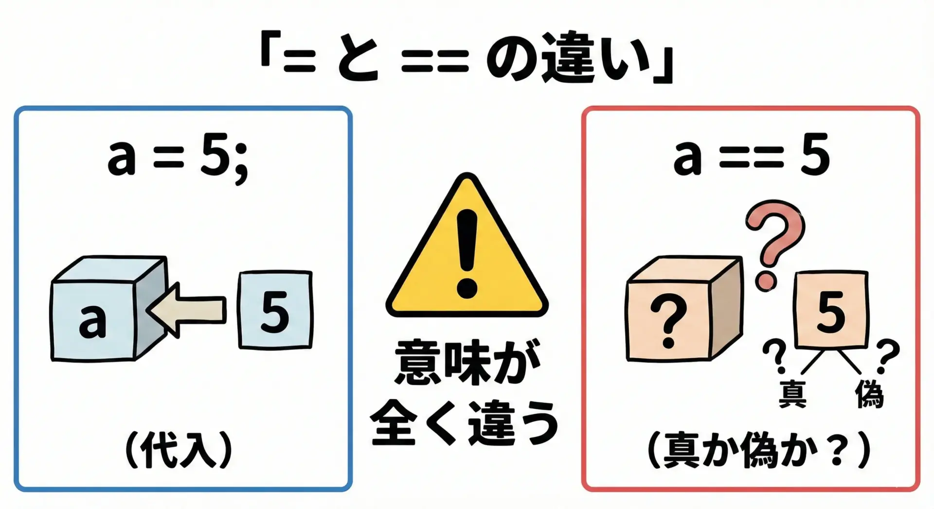 比較には必ず==を使うことを習慣づけてください。