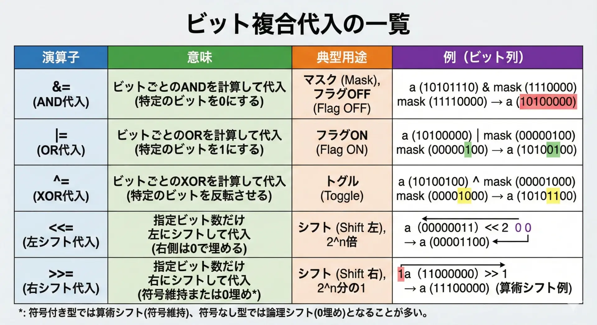 右辺→左辺の評価順序や、初期化との違い、ビット演算におけるマスクやフラグ操作、さらに代入式が値を返す性質と型変換の影響まで押さえることが重要です。