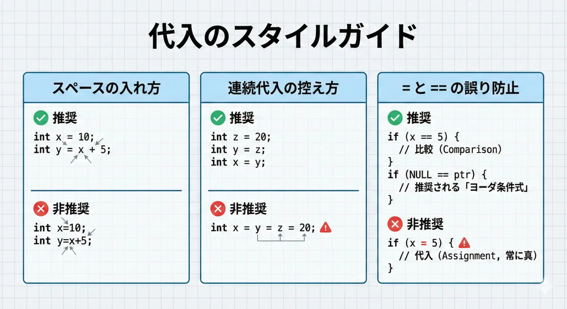 代入演算子は頻出するため、読みやすさやバグの防止を意識した書き方が重要です。