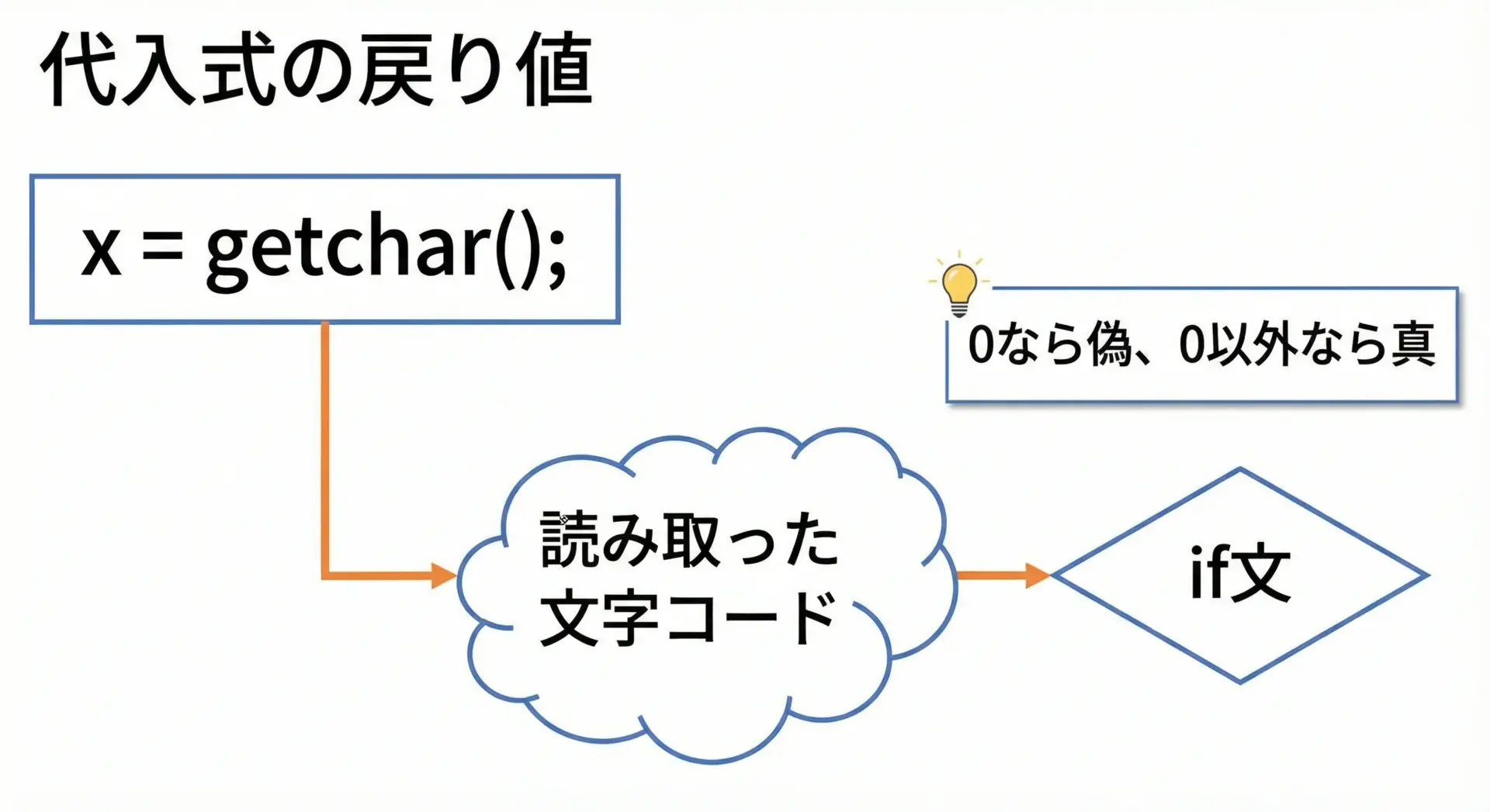 このように入力関数の結果を代入して、そのまま比較に使う書き方はC言語でよく見られます。
