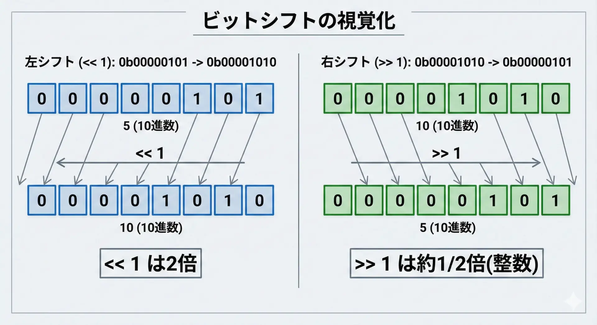+=&=などの複合代入は便利ですが、「元の値に足し込む」「このビットをONにする」などの意図が明確な場合に使うと、コードの目的が読み取りやすくなります。