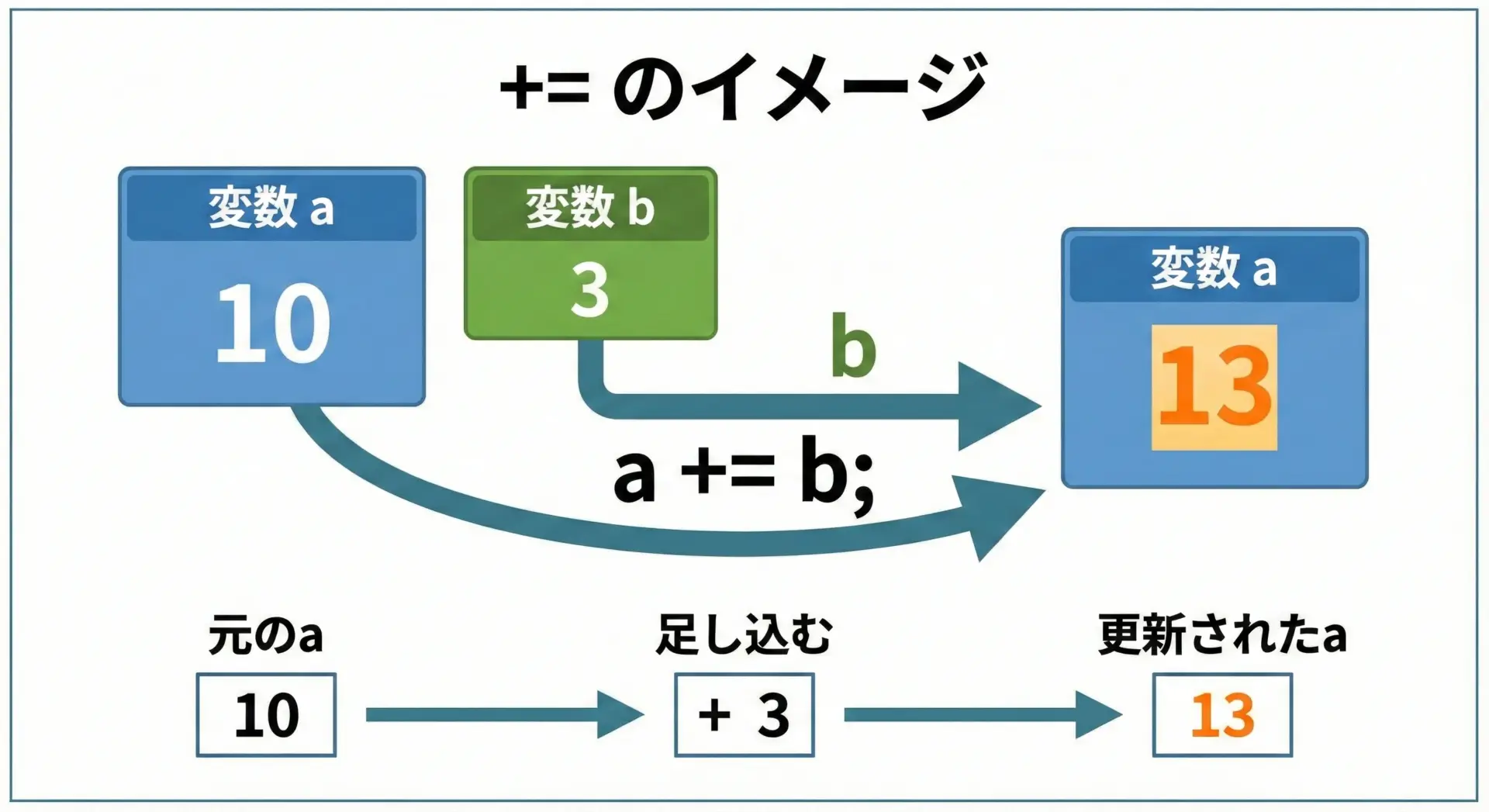 +=は「左辺に右辺を足し込む」演算子です。