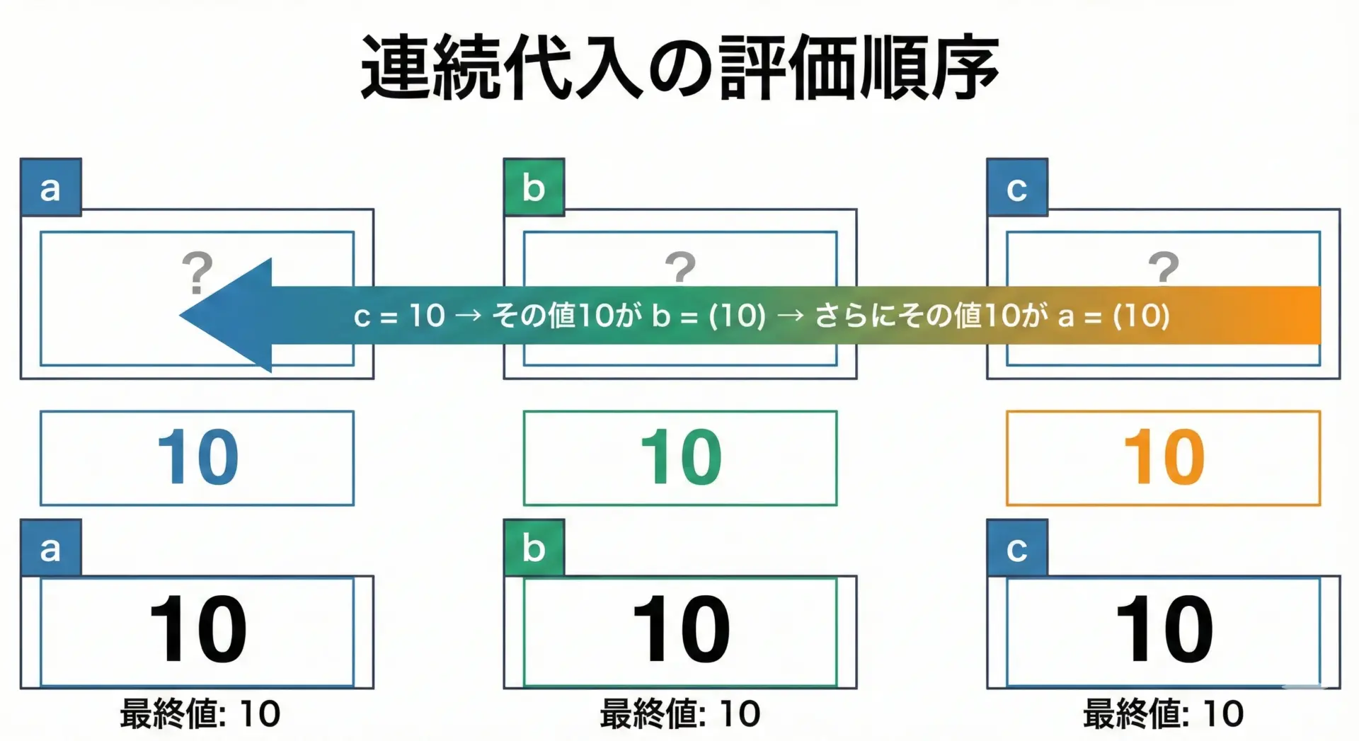 このように、代入は右から左に結合するため、まずc = 10が評価され、その値10がb = 10、さらにa = 10へと連鎖していきます。