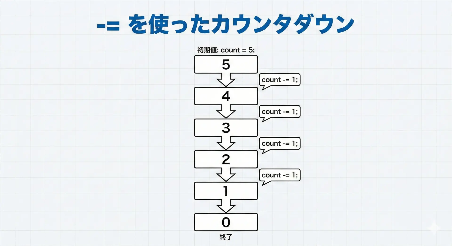 count -= 1;   // count = count - 1; と同じ