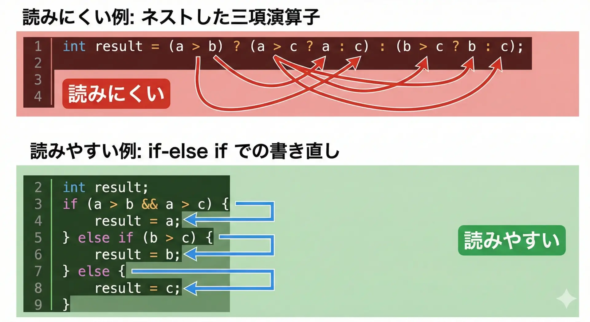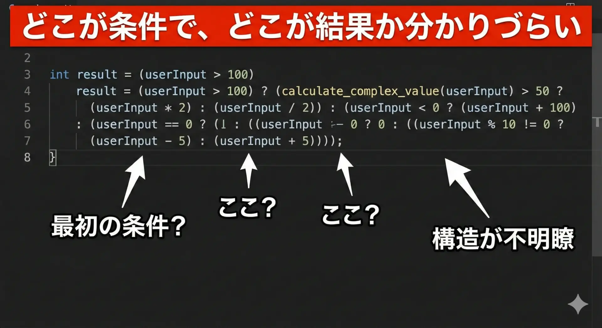 特に避けたいのは、条件式が長すぎる、真偽の式が複雑すぎるといったケースです。