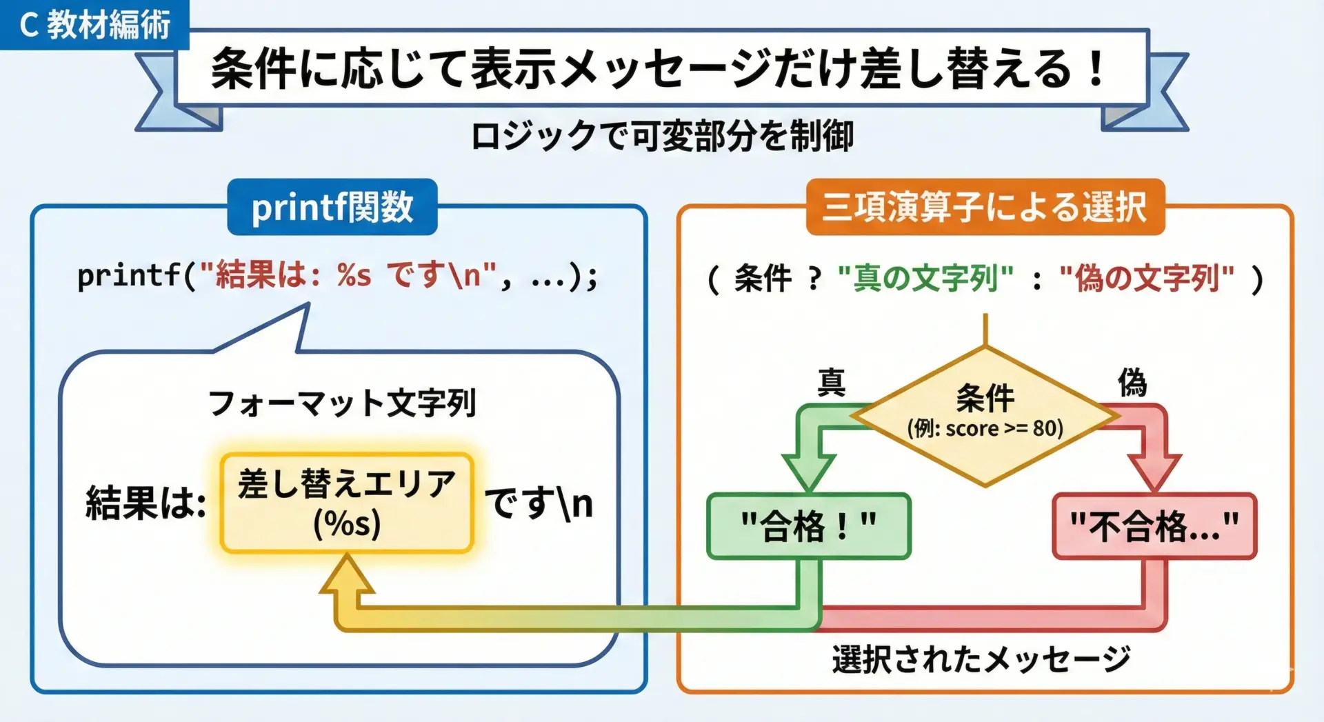 ここでは、(score >= 60) ? "合格" : "不合格"が、そのまま%sに渡される文字列として機能しています。