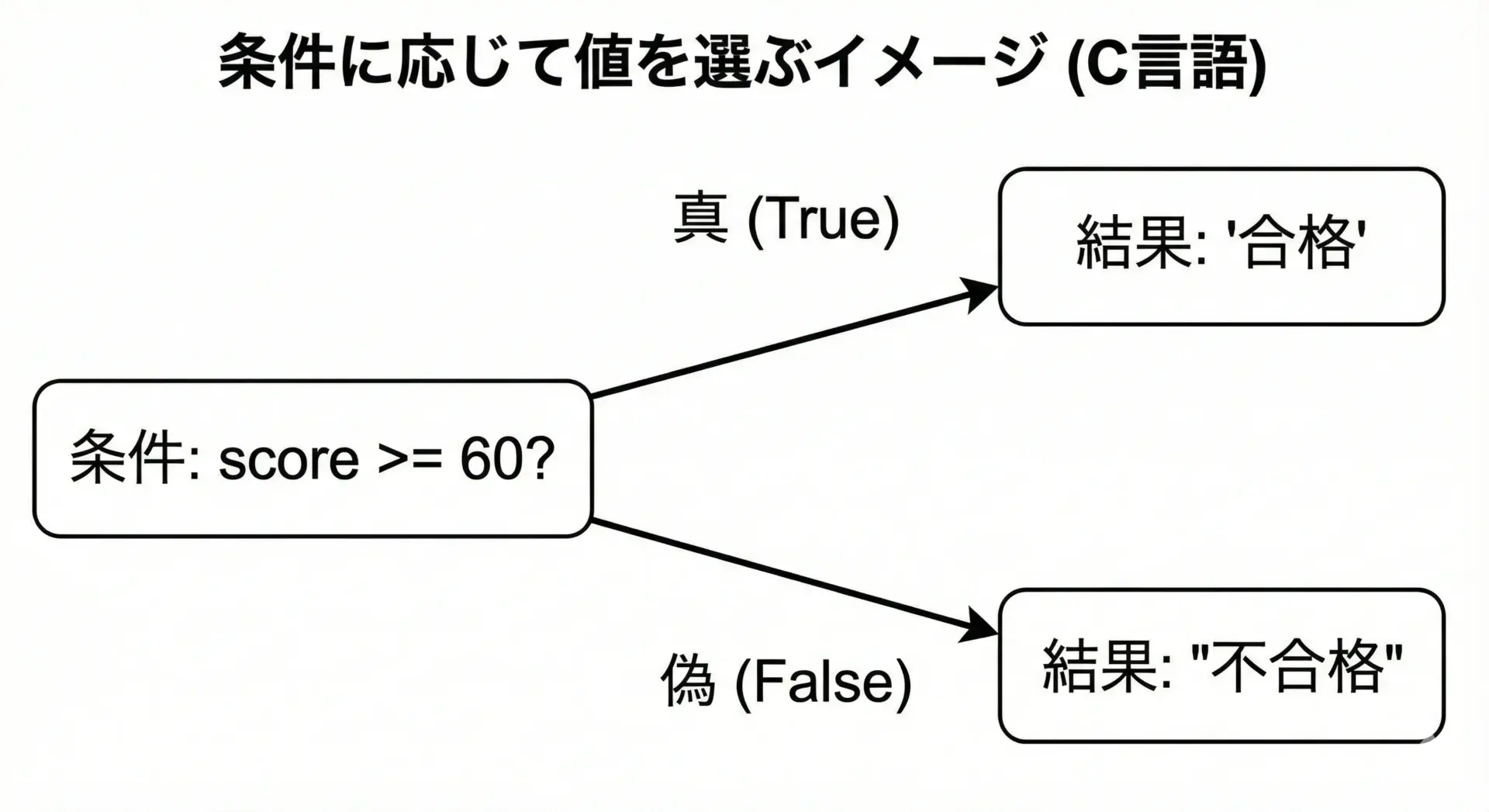 C言語では、条件式の結果が「真」か「偽」かによって、評価される式が切り替わります。