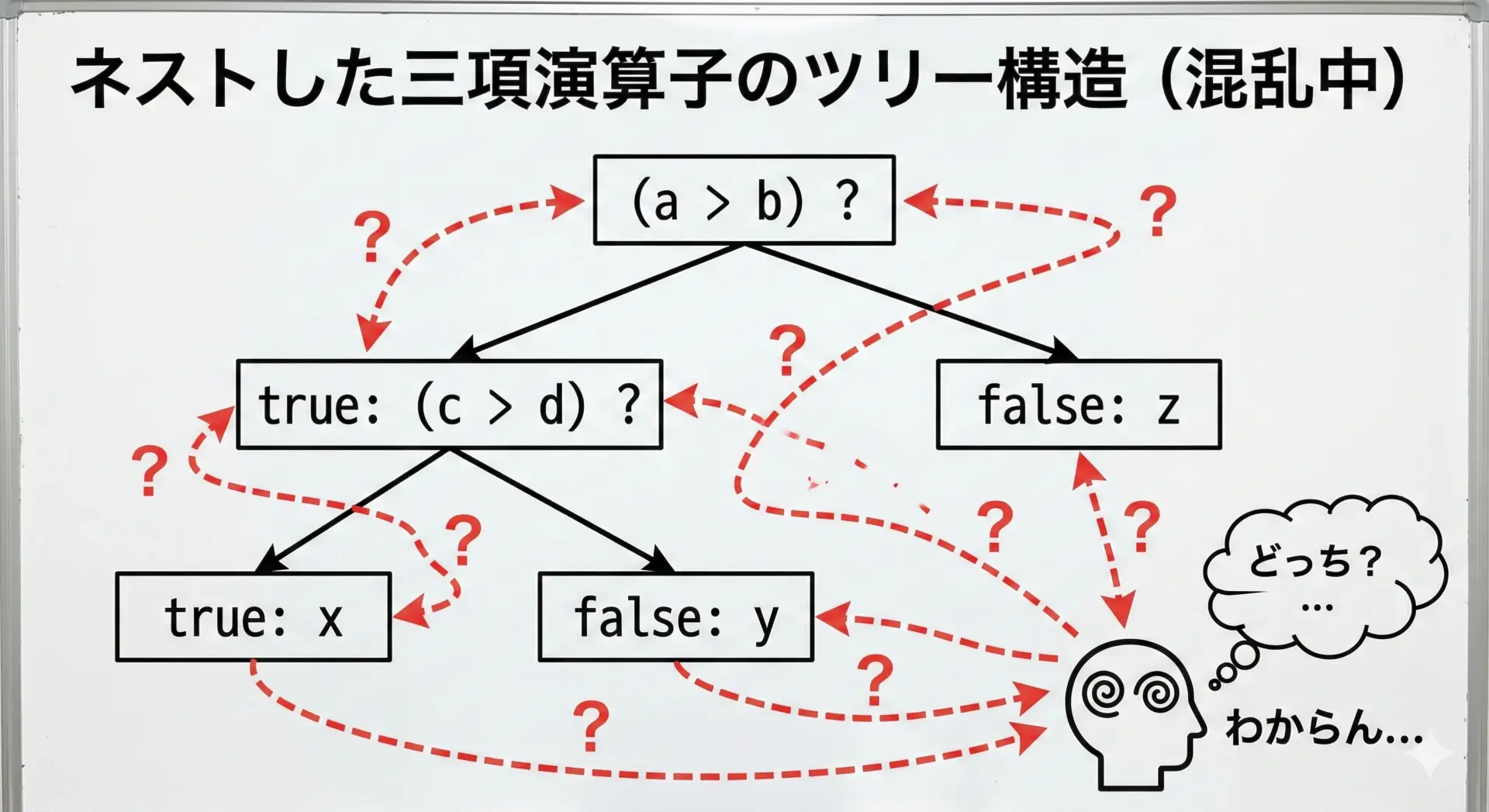 ネストした三項演算子が危険な理由をまとめると、次のようになります。