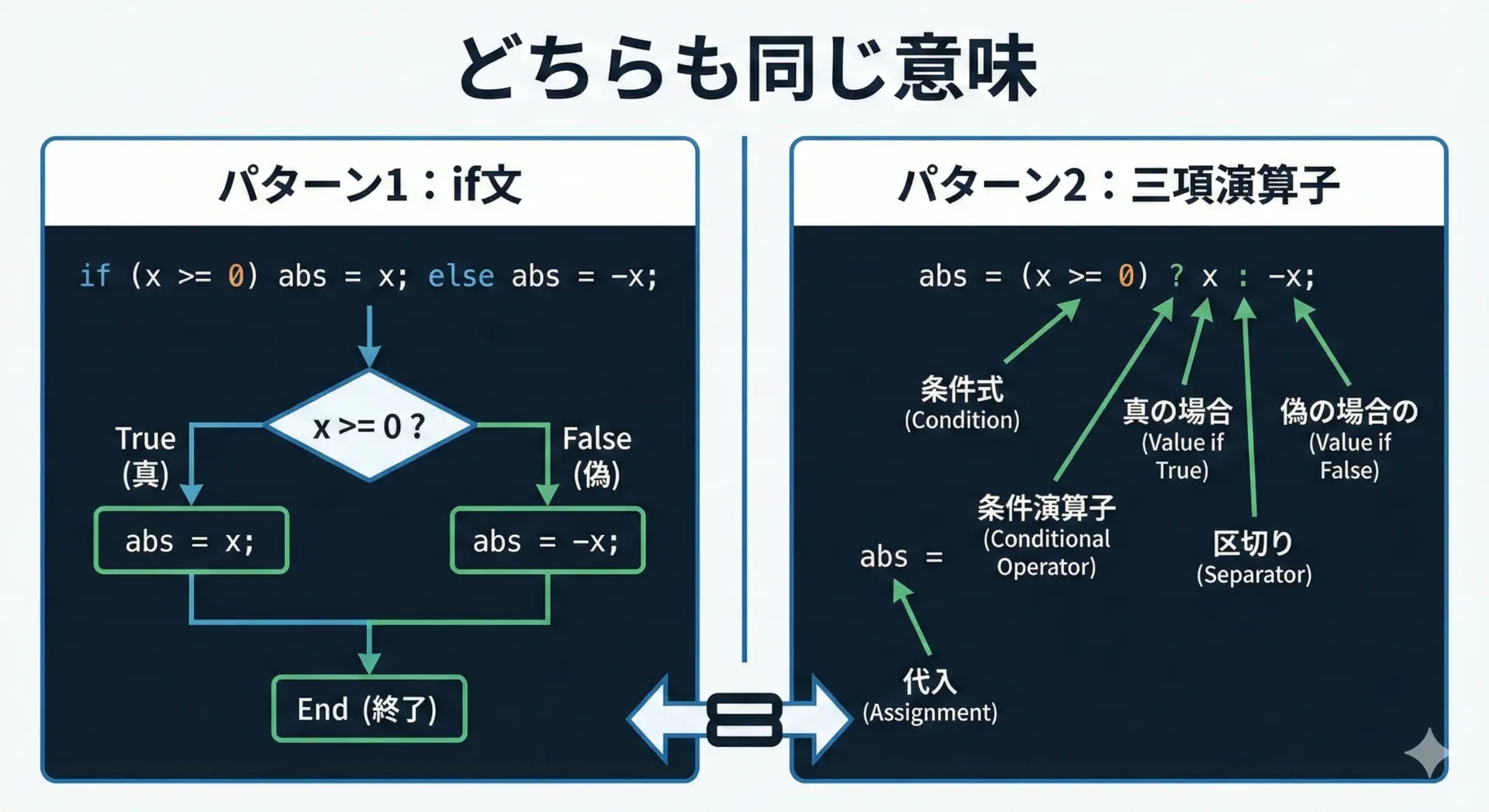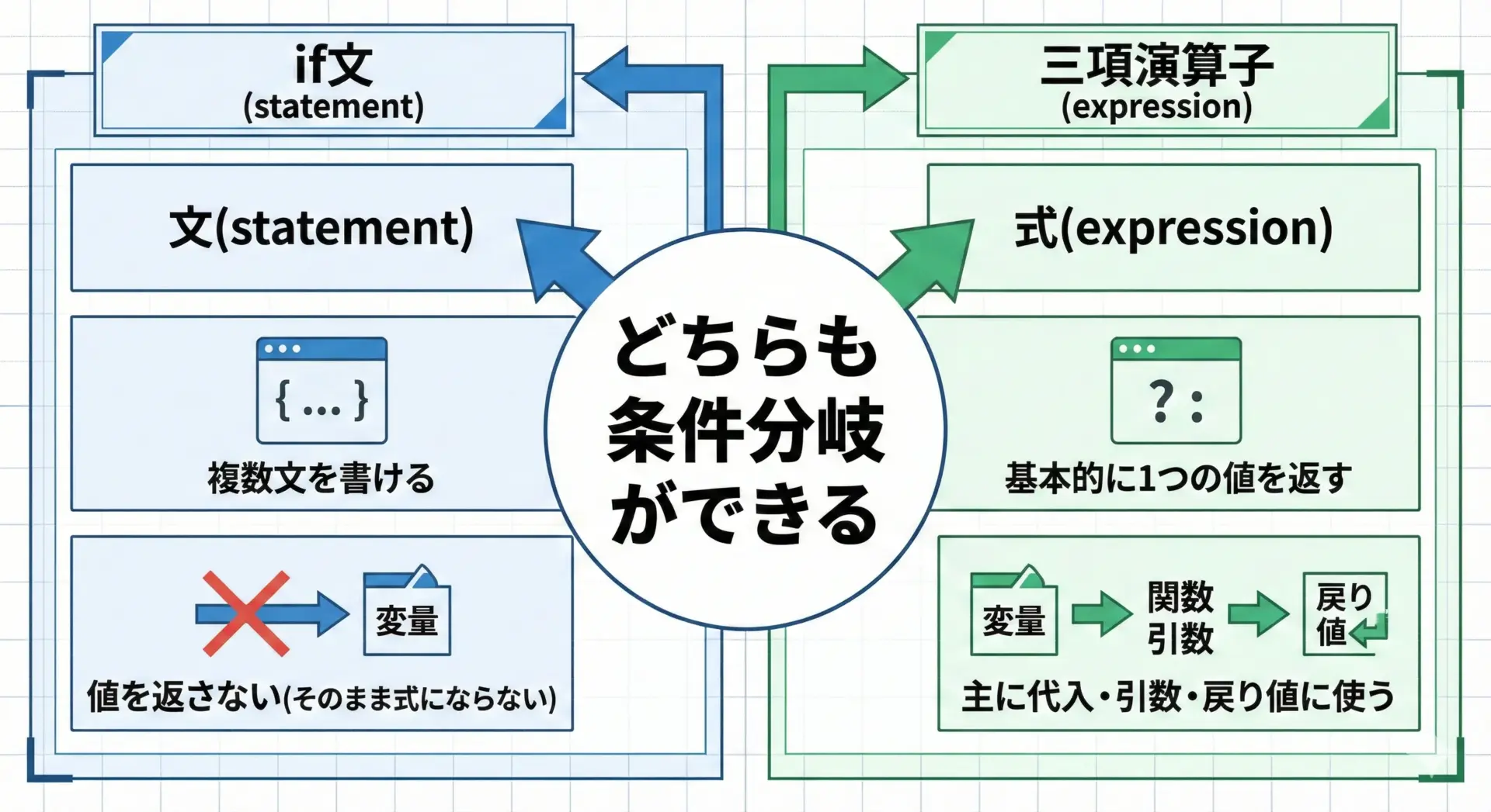 この違いを理解しておくと、「どこで三項演算子を使うべきか」「どこからif文に切り替えるべきか」の判断がしやすくなります。