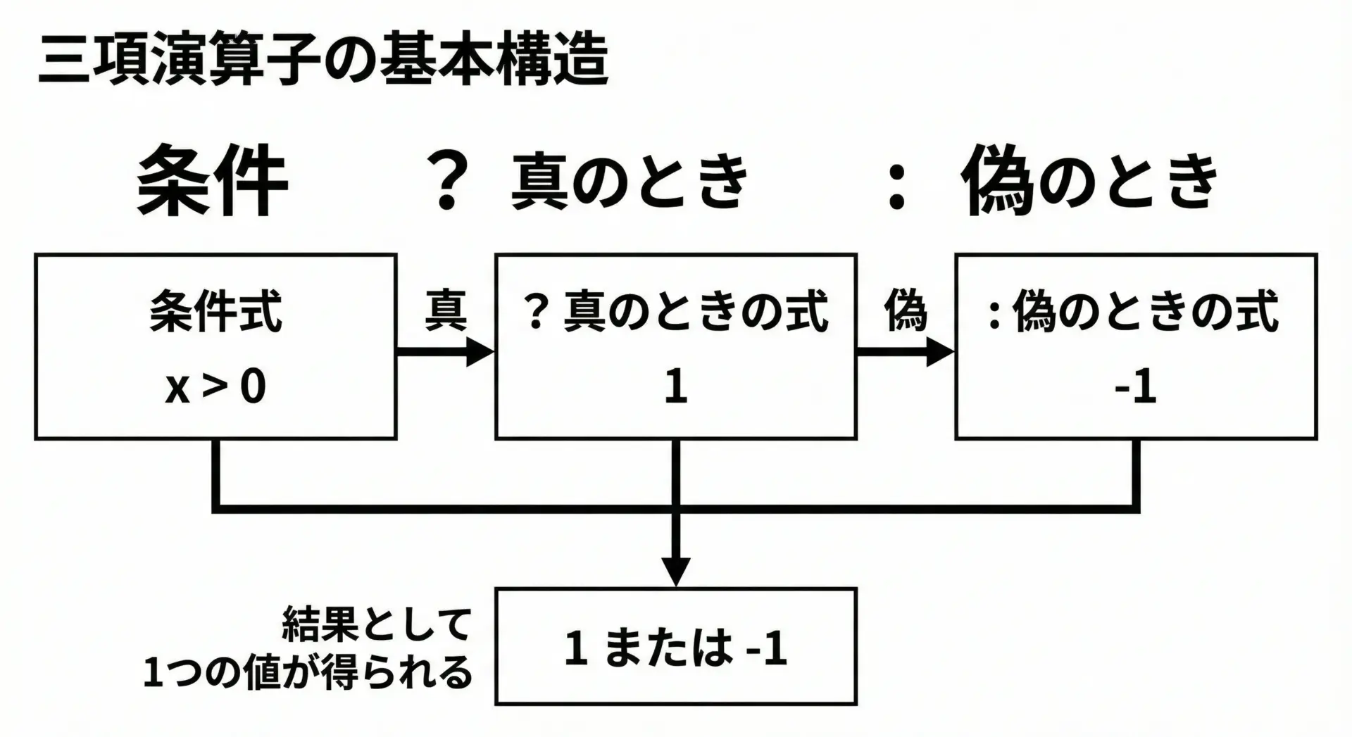 三項演算子の基本構文は、次のようになります。