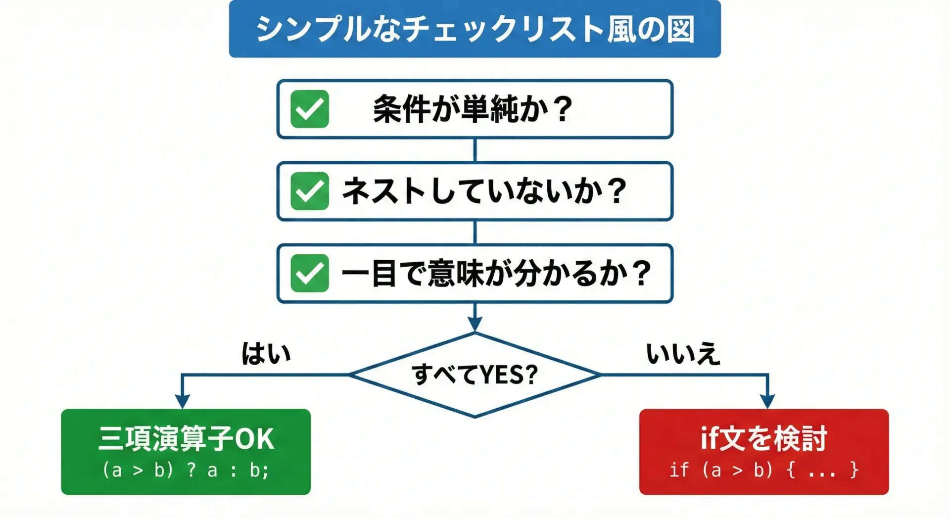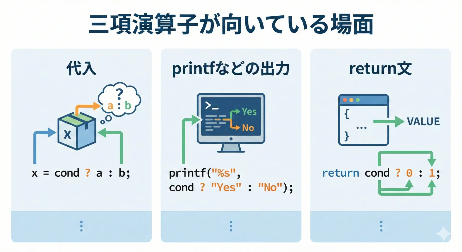 シンプルな2択で代入・printf・returnに使うといったルールを決め、迷ったらif文に戻すことで、三項演算子のメリットだけを上手に活かすことができます。