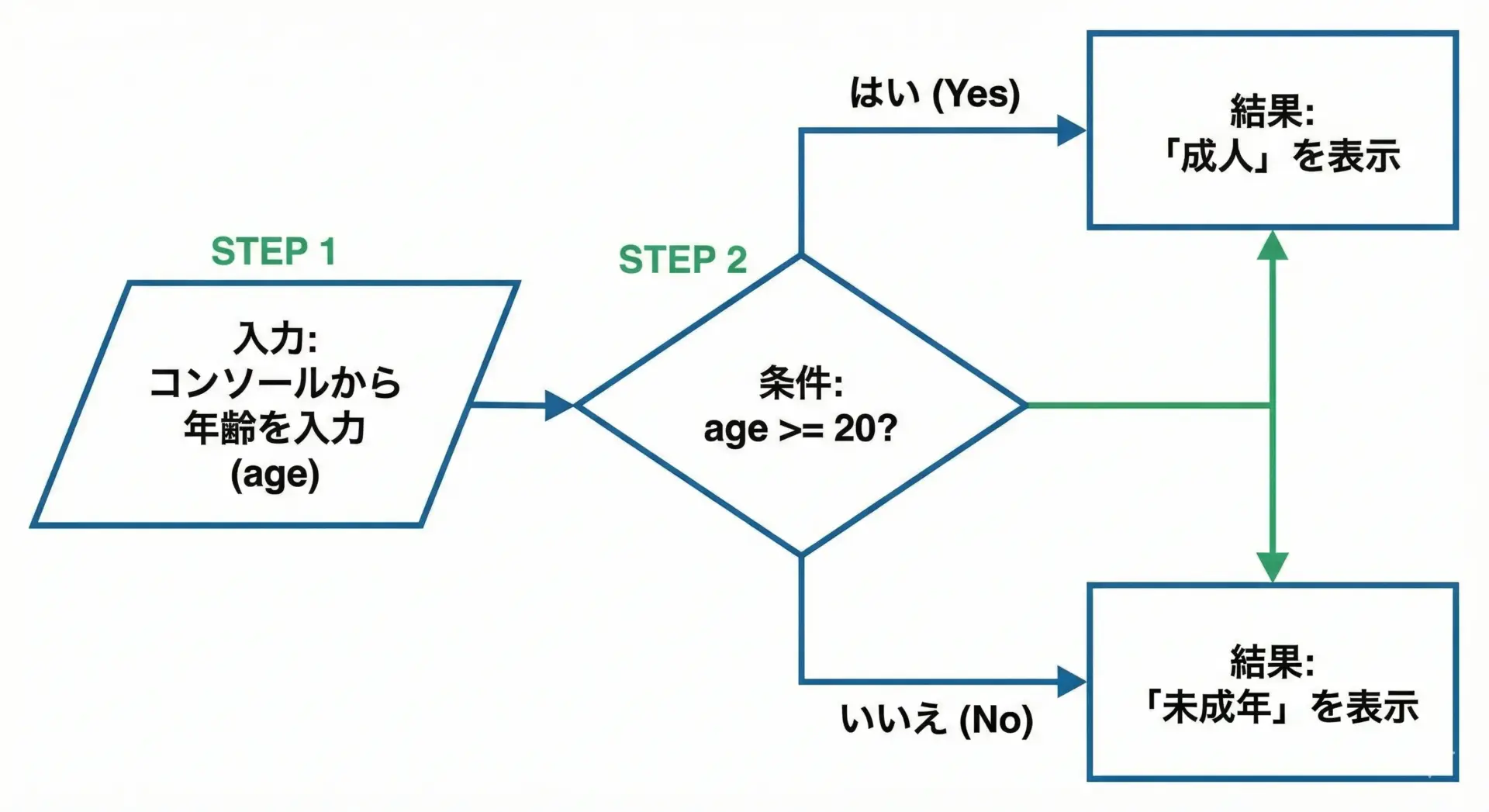 以下は、年齢を入力して成人かどうかを判定する例です。